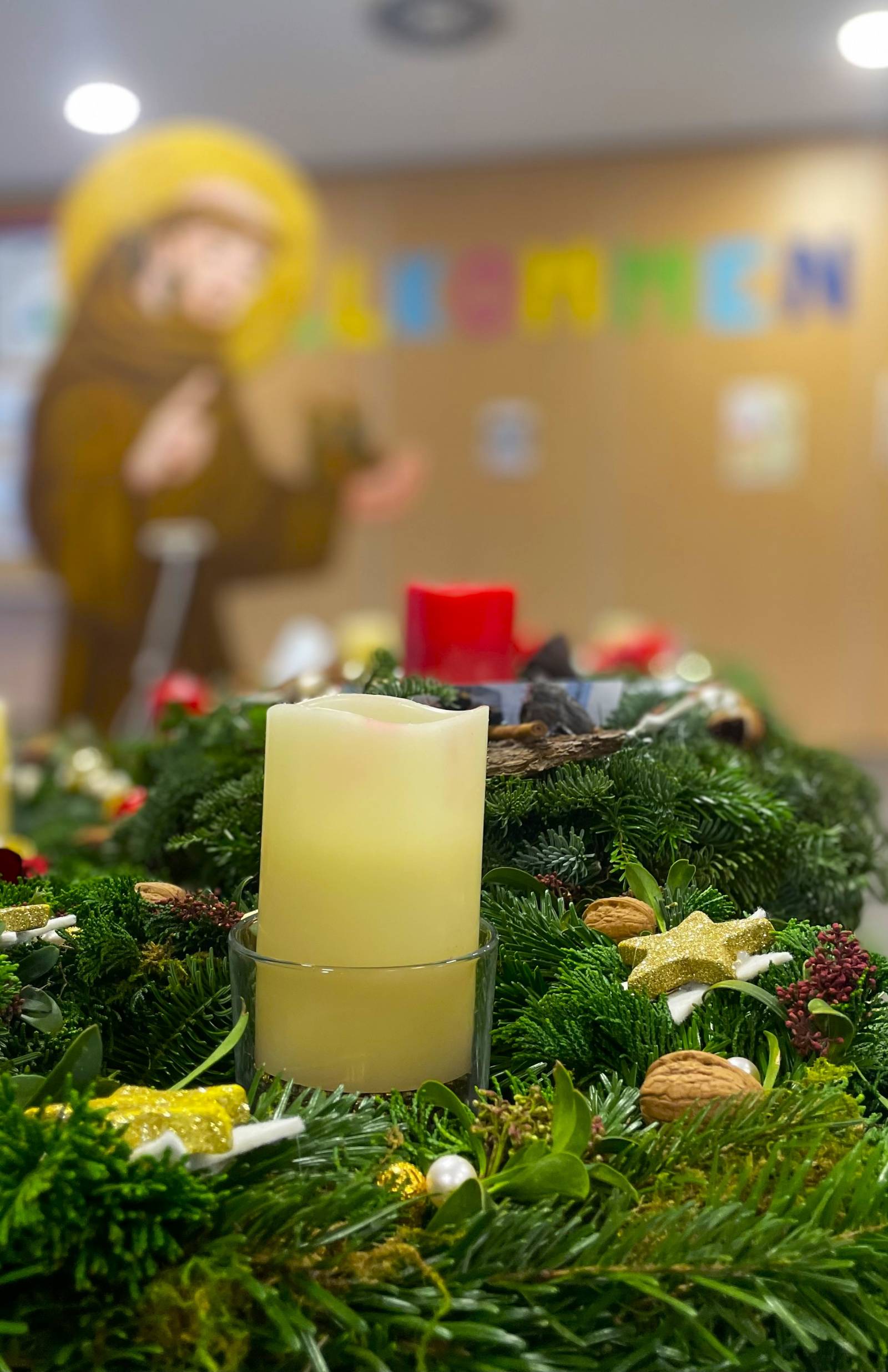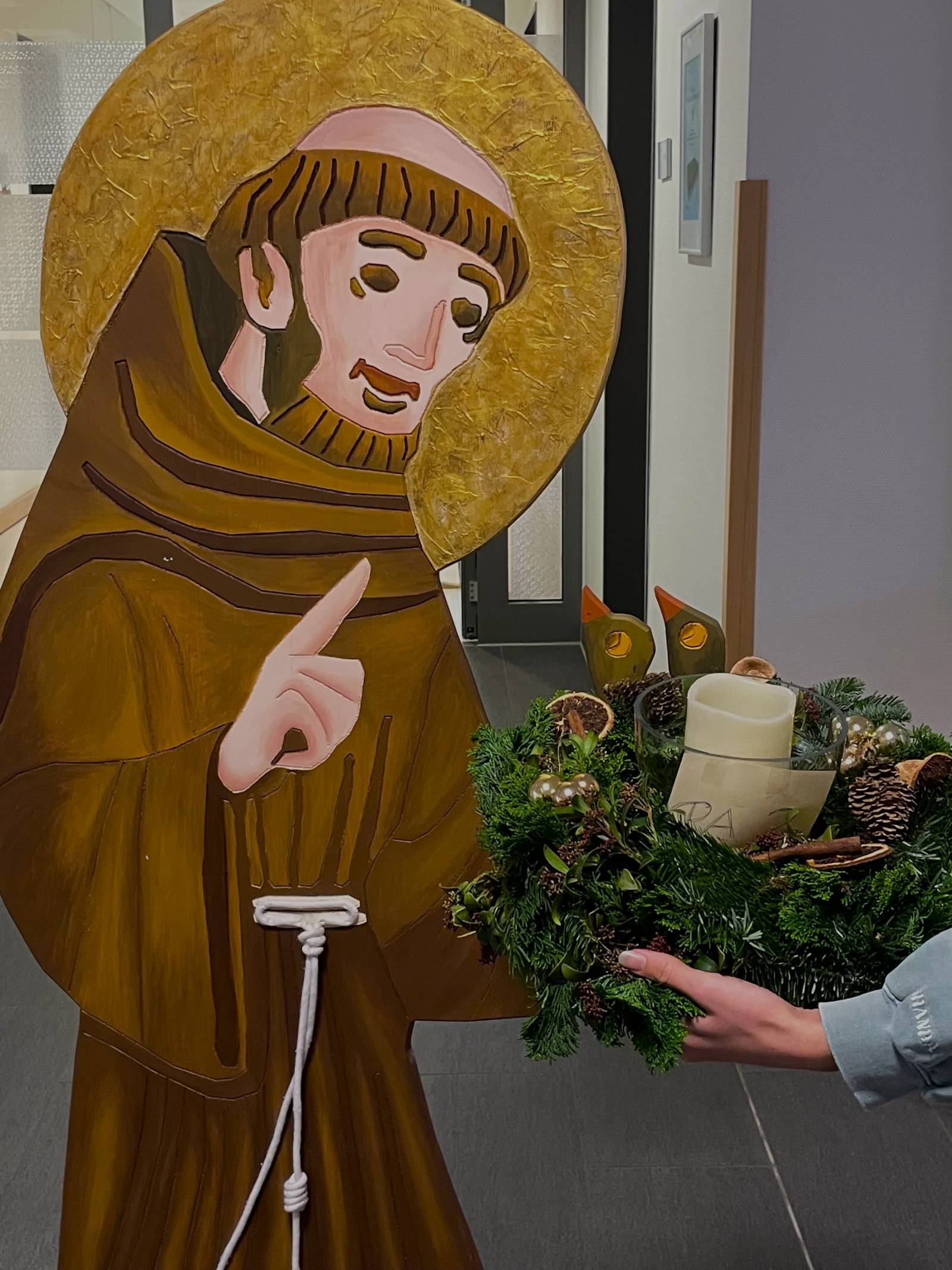 Im Gottesdienst zur Adventskranzsegnung sprach Frau Lis davon, wie sich das Jahresmotto der Schule „Frieden denken – Frieden schenken“ mit dem Heiligen Franziskus verbinden lässt. Sein und das Motto seiner Nachfolgerinnen und Nachfolger „Pax et Bonum“ („Frieden und Gutes“) kann auch für uns alle an der Schule und insbesondere in der Adventszeit gelten.