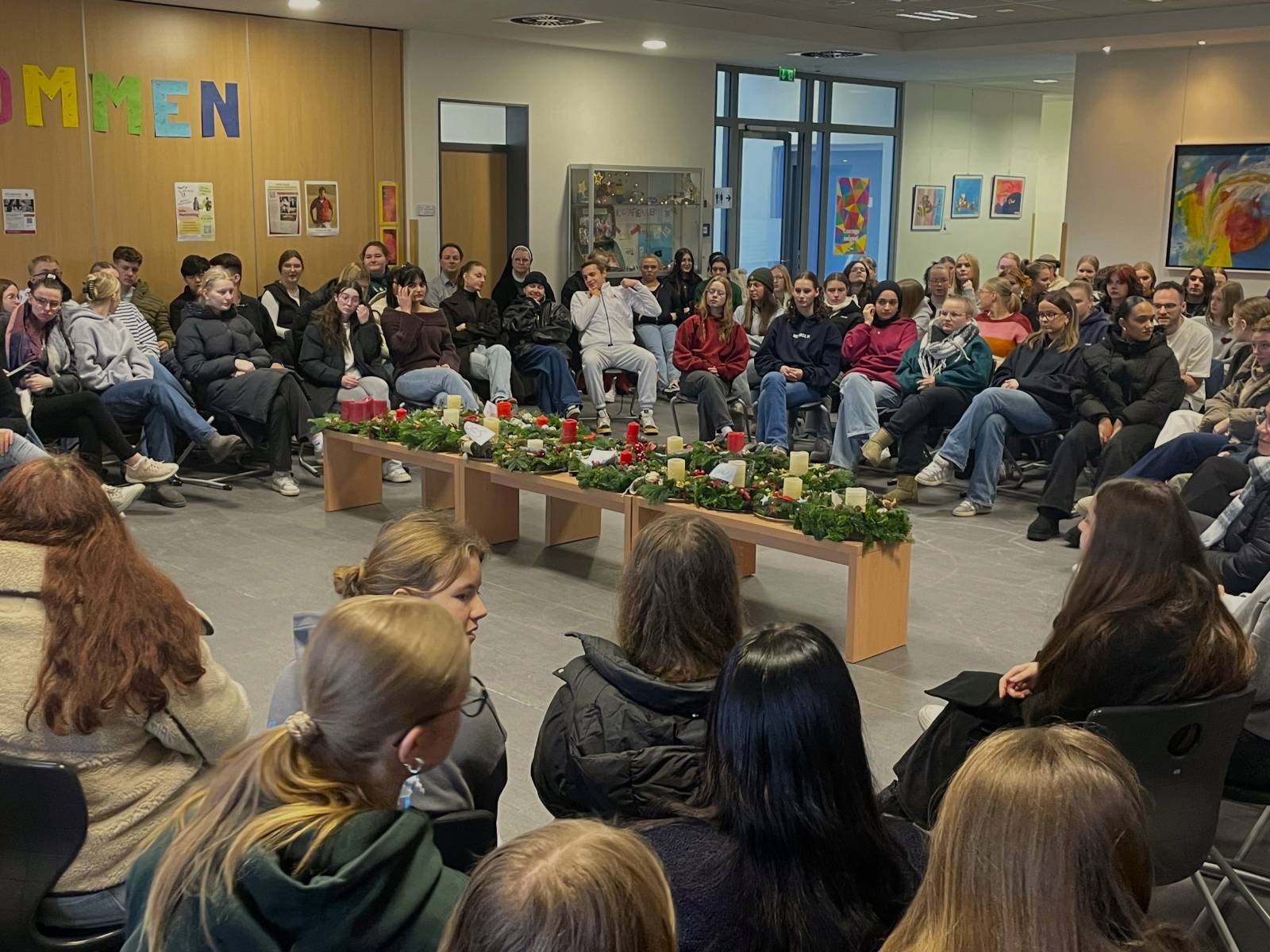 Die Klassensprecherinnen und -sprecher und einige Lehrkräfte versammelten sich mit den Kränzen für die jeweiligen Klassen in einem Kreis. Und so wurde der Segen der gesamten Schulgemeinschaft zeichenhaft über die Kränze gesprochen, damit er Frieden und Gutes in den Klassen bringen möge. Das Lied „Herr, gib uns deinen Frieden“ kam gut an, so waren im Laufe des Schultages immer wieder Schülerinnen oder Schüler zu hören, die dieses Lied summten. Wir wünschen allen eine frohe, friedliche und besinnliche Adventszeit!