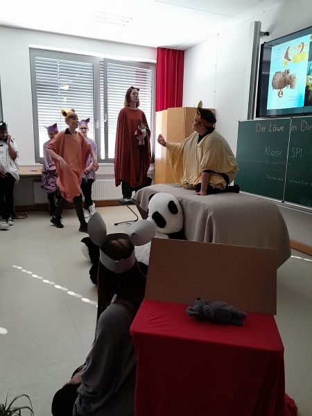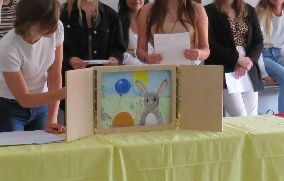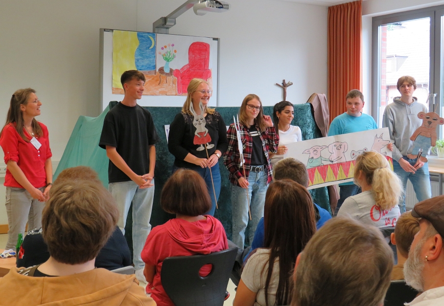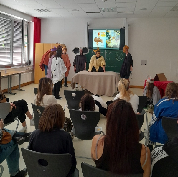 Highlight der Veranstaltung: Die Präsentationen der Schüler:innen. Stabpuppentheater, Erzähltheater und ein gespieltes Bilderbuch begeisterten die Besucher und die Schüler:innen freuten sich über viel Applaus und volle Zuschauerräume. Die „Gesundheitsklassen“ präsentierten Aktionen aus ihren Bildungsgängen und zeigten in Rollenspielen Pflegesituationen und im Bewegungsraum konnten sich Gäste z. B. Übungen bei Arthrose zeigen lassen oder einen Rollstuhl ausprobieren.