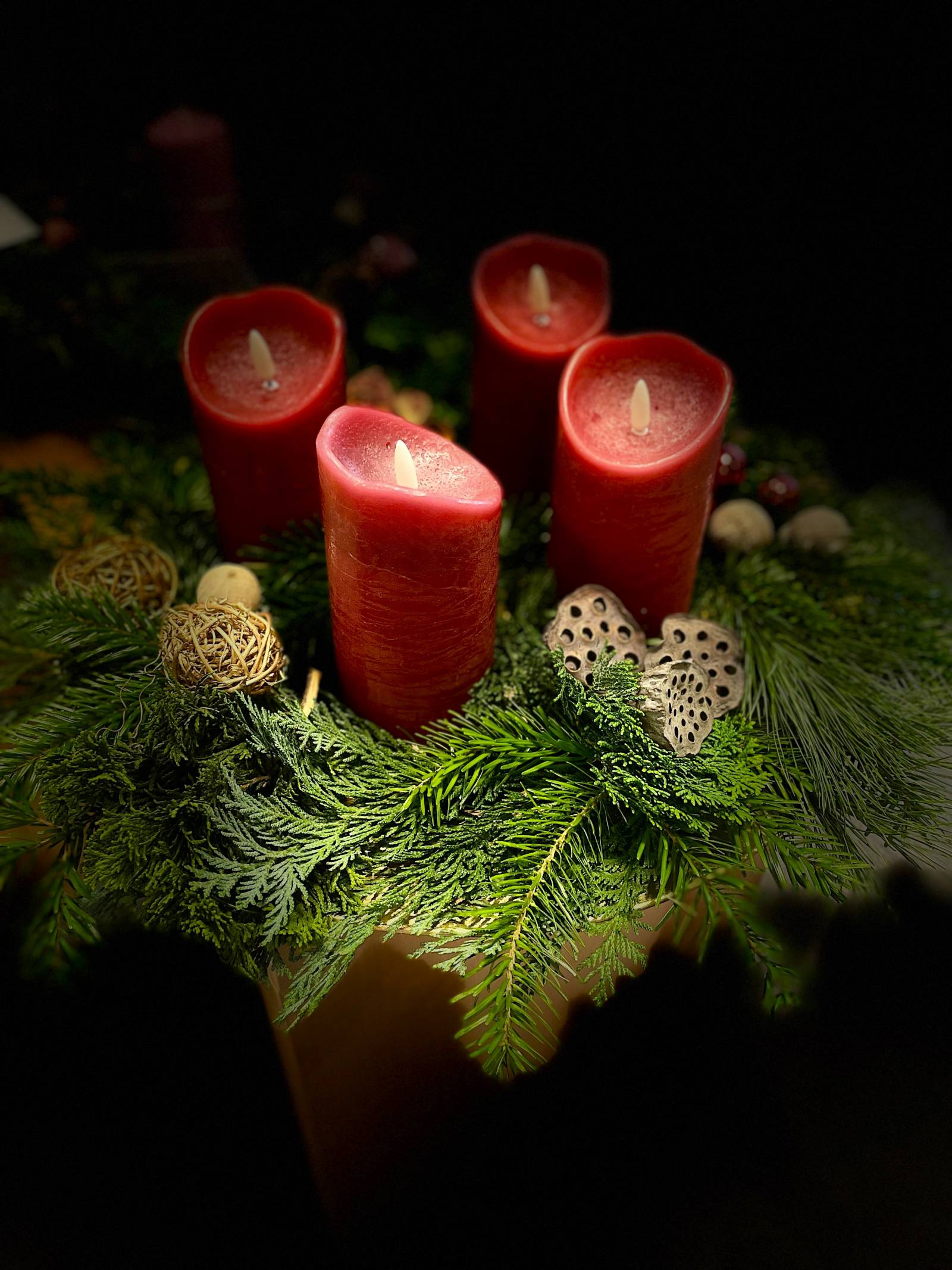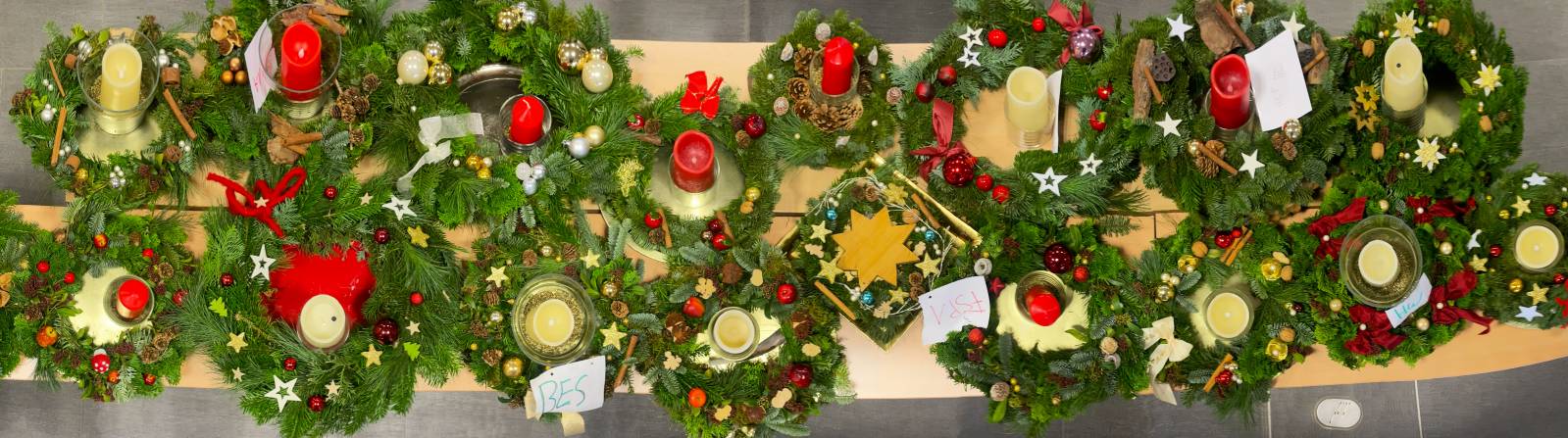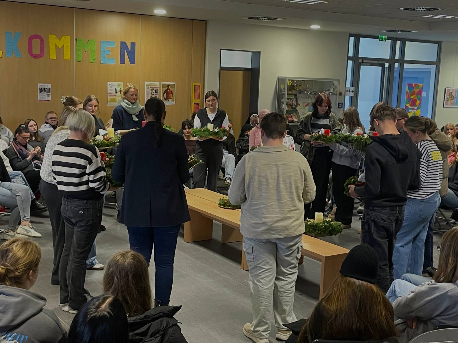 Am Donnerstag vor dem ersten Advent traf sich die gesamte Schulgemeinschaft der BBS Thuine zur gemeinsamen Adventskranzsegnung. Die Klassen FSP 1, HW und BES hatten zusammen mit der Abteilung Hauswirtschaft unter der großartigen Federführung von Frau Hermeling viele Adventskränze- und -gestecke gebunden, gesteckt und geschmückt, sodass nun in allen Klassen und im Lehrerzimmer ein Adventskranz steht und leuchten kann. Ein großes Dankeschön!