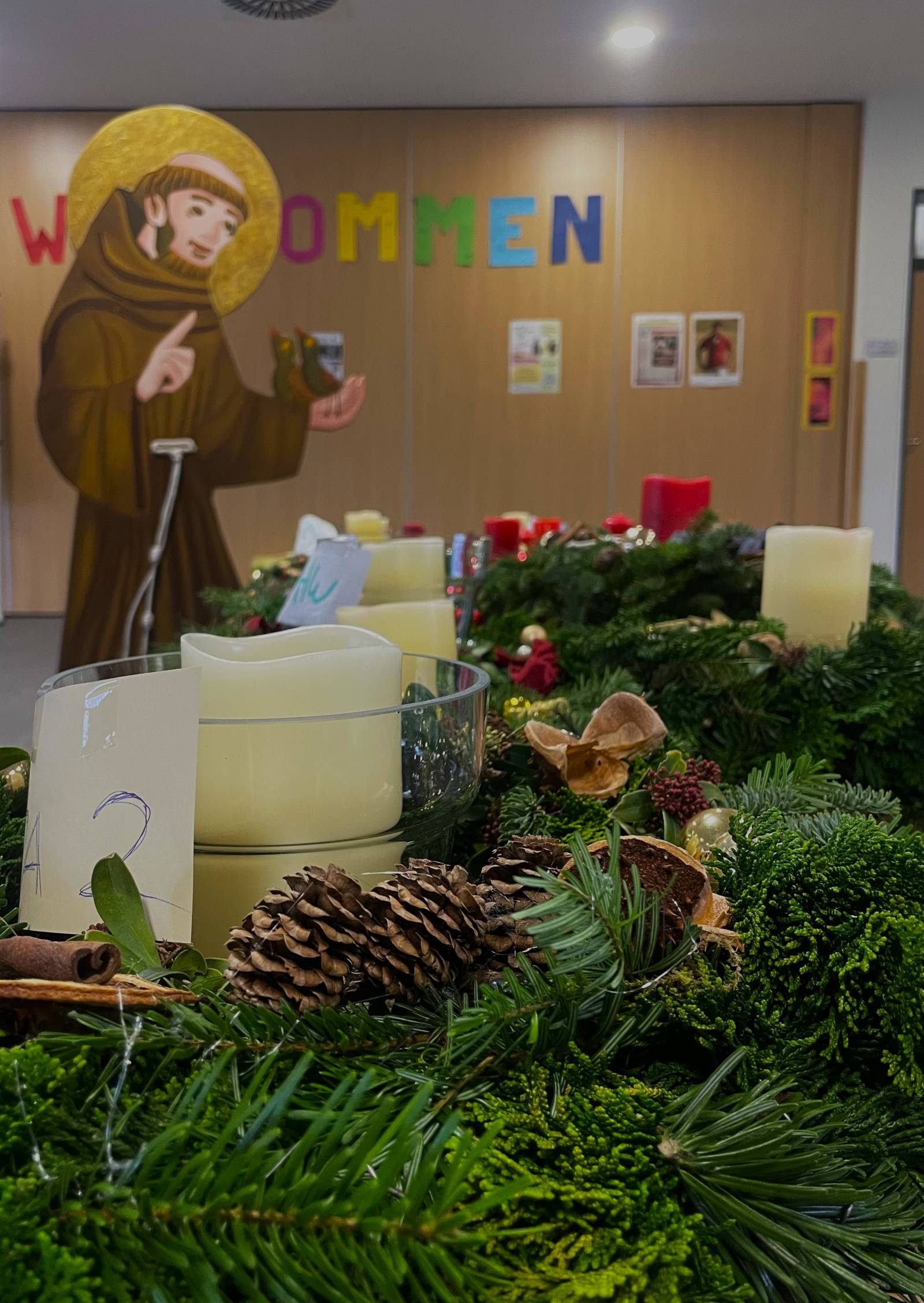 Im Gottesdienst zur Adventskranzsegnung sprach Frau Lis davon, wie sich das Jahresmotto der Schule „Frieden denken – Frieden schenken“ mit dem Heiligen Franziskus verbinden lässt. Sein und das Motto seiner Nachfolgerinnen und Nachfolger „Pax et Bonum“ („Frieden und Gutes“) kann auch für uns alle an der Schule und insbesondere in der Adventszeit gelten.