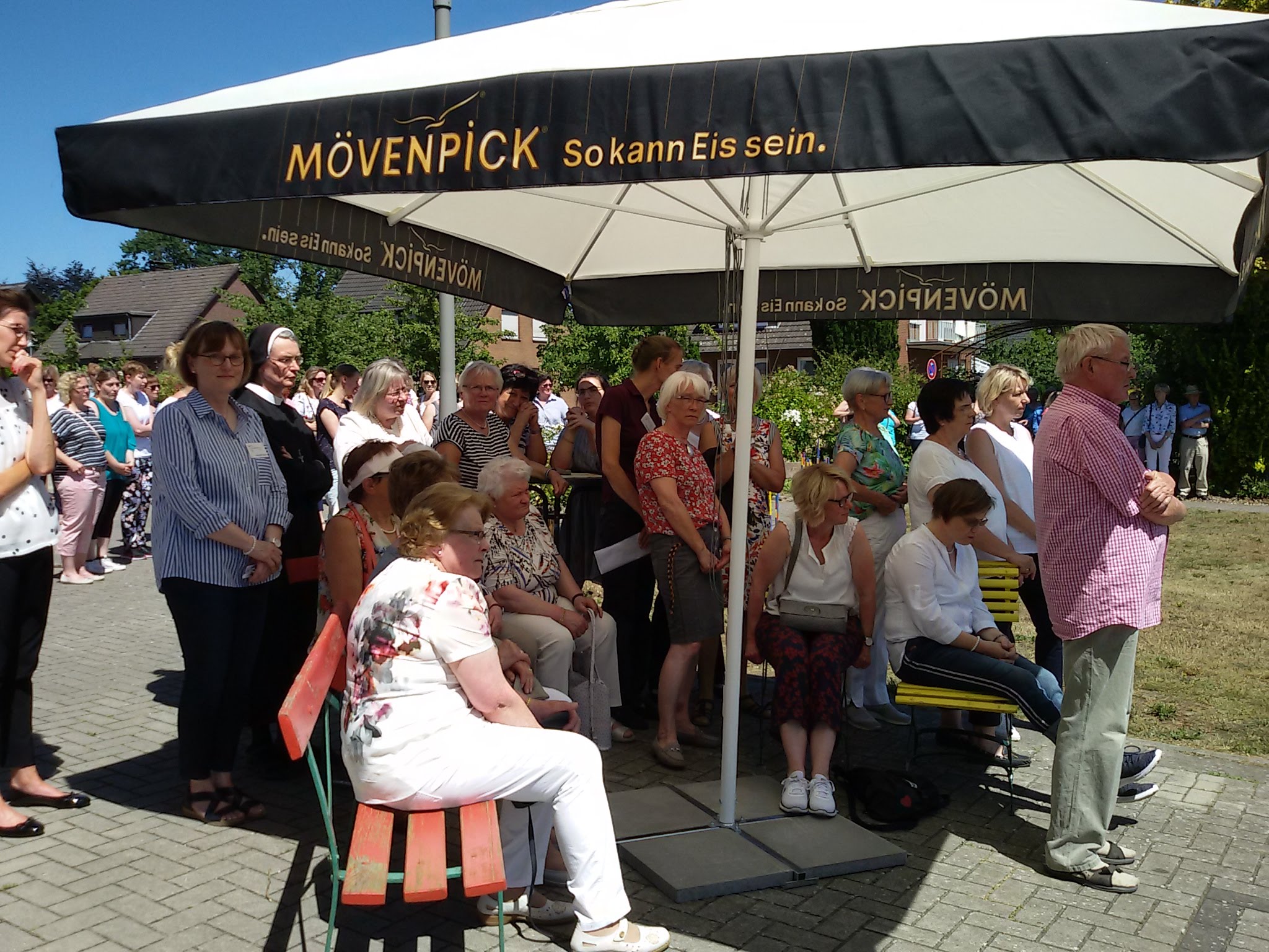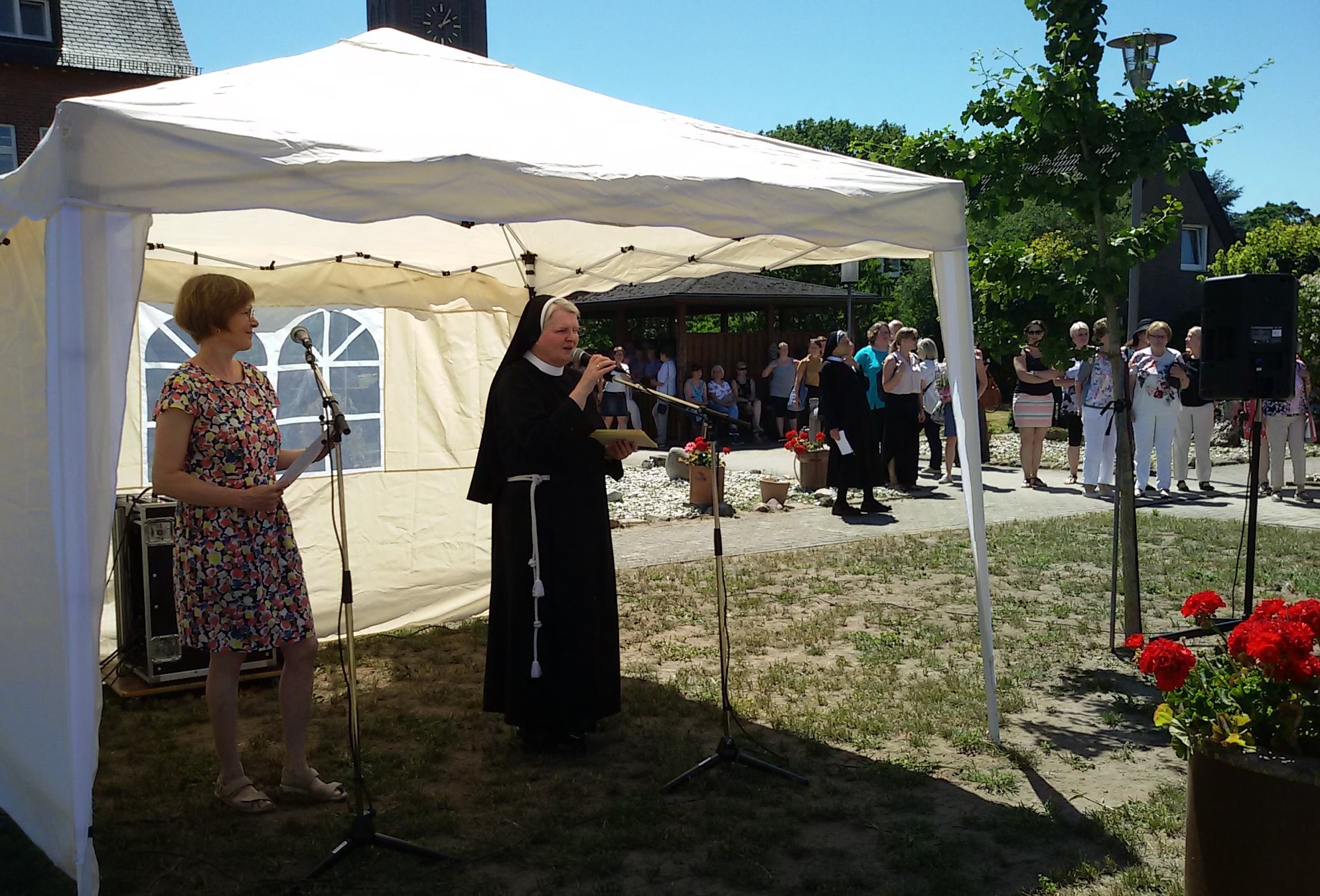 „Weil die Renovierung zu teuer geworden wäre, hat die Ordensleitung sich dazu entschlossen, eine neue Lehrküche mit Speisesaal und Wirtschaftsräumen an die bereits 2008 errichtete neue Schule anzubauen“, erklärte die Generaloberin der Thuiner Franziskanerinnen, Schwester Maria Cordis Reiker, bei der Begrüßung der aus nah und fern angereisten Gäste.