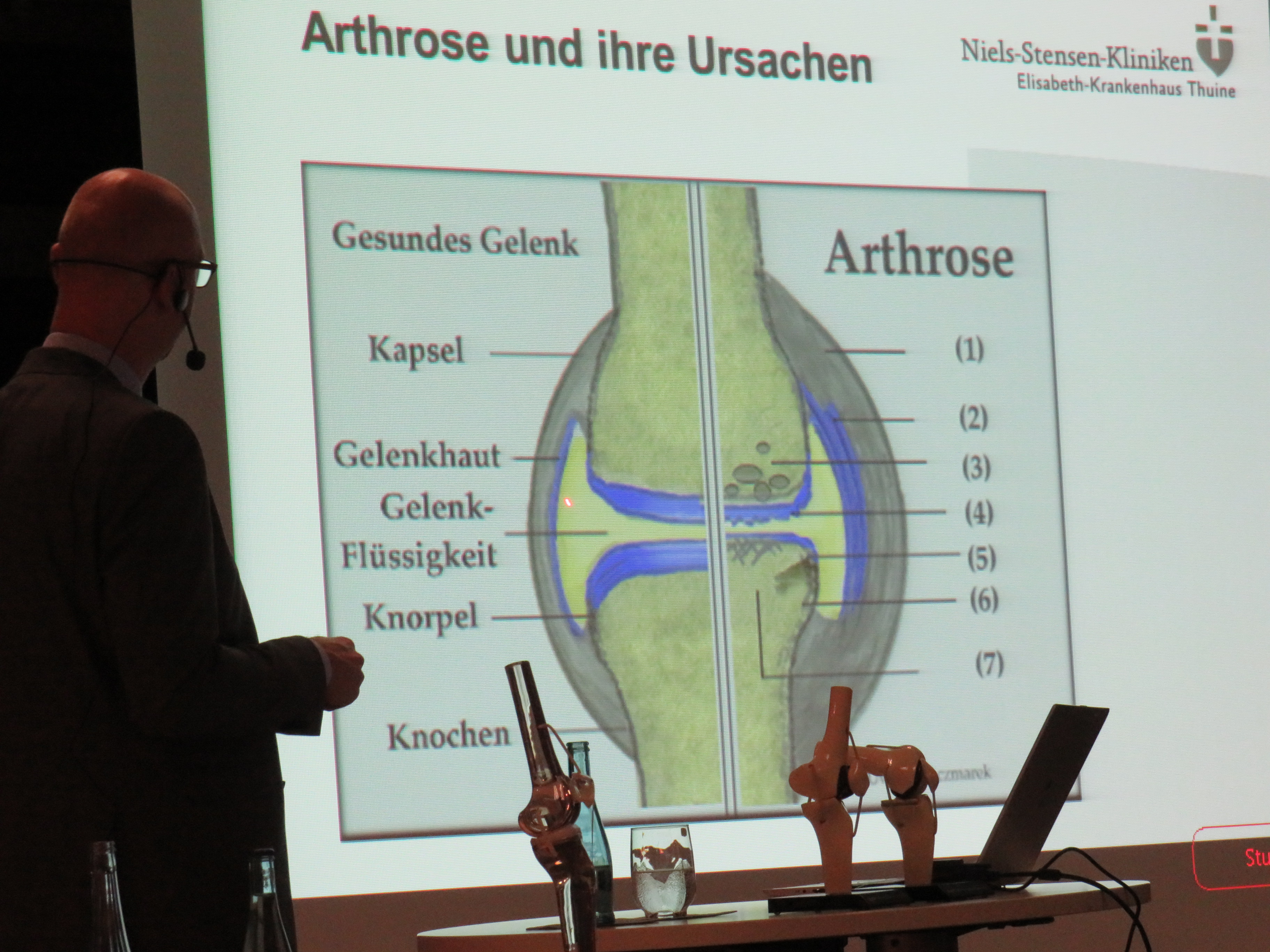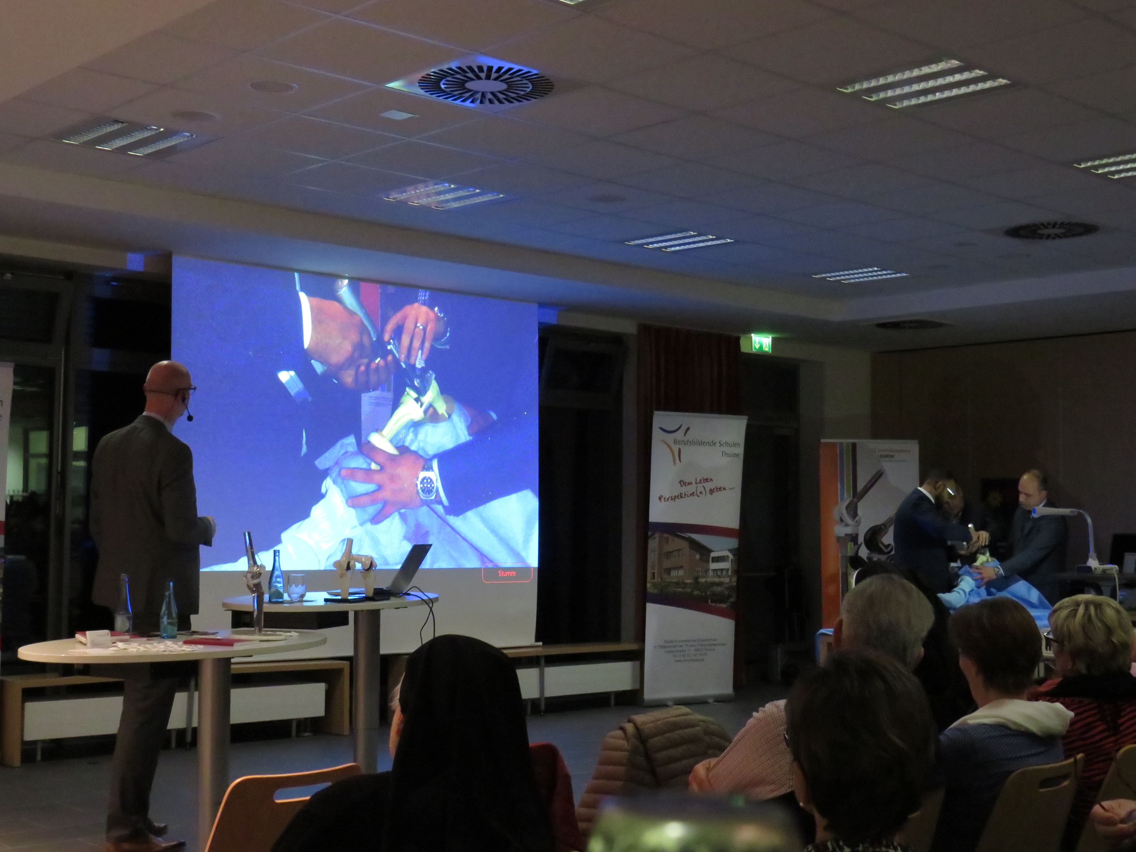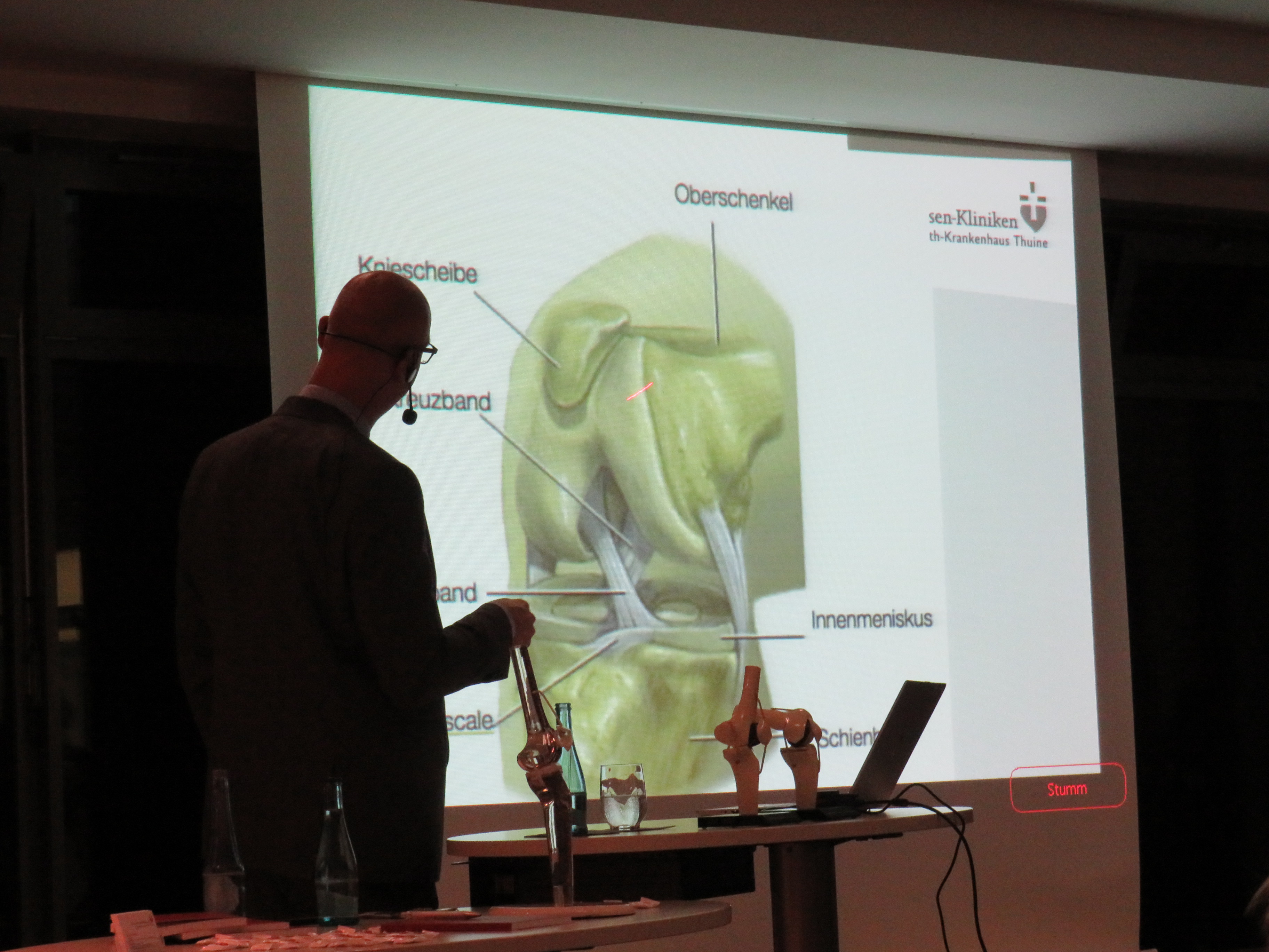 Schmitz ging bei dem Infoabend der Klinik für Orthopädie, Endoprothetik und Unfallchirurgie auf neueste Entwicklungen der Endoprothetik ein und zeigte mit seinen Kollegen in einer Live-OP am Kunstknochen, wie die Eingriffe vorgenommen werden.