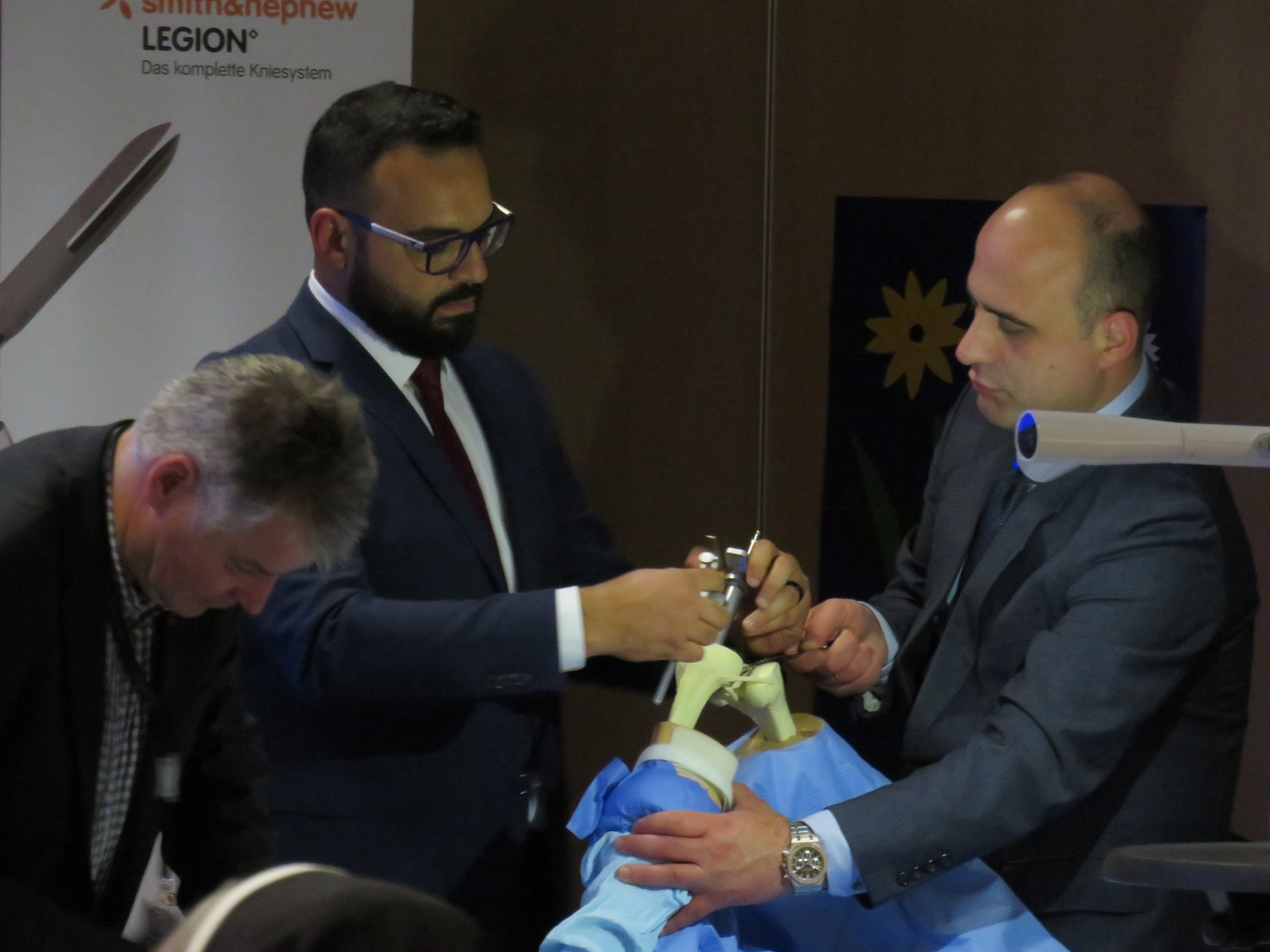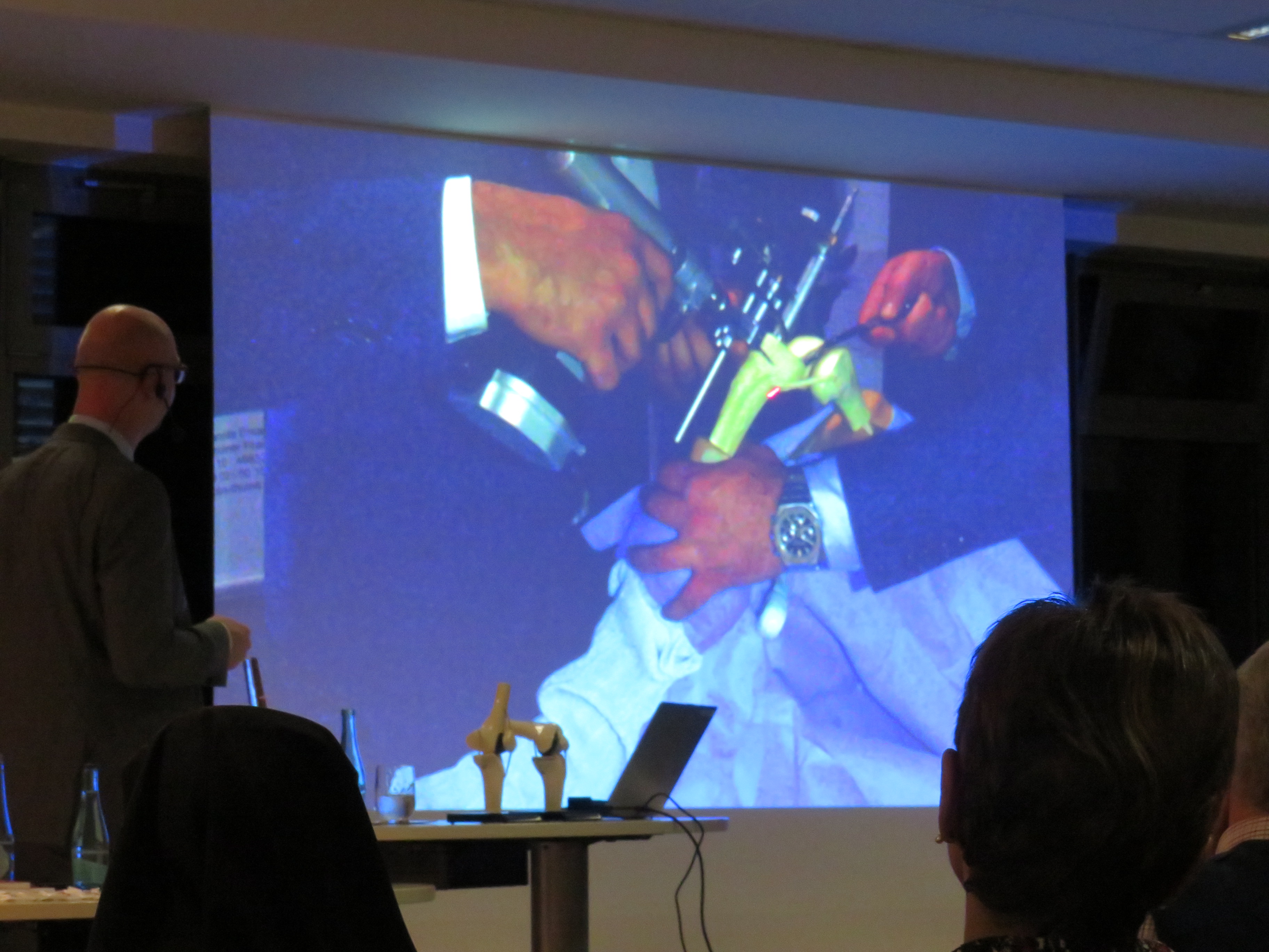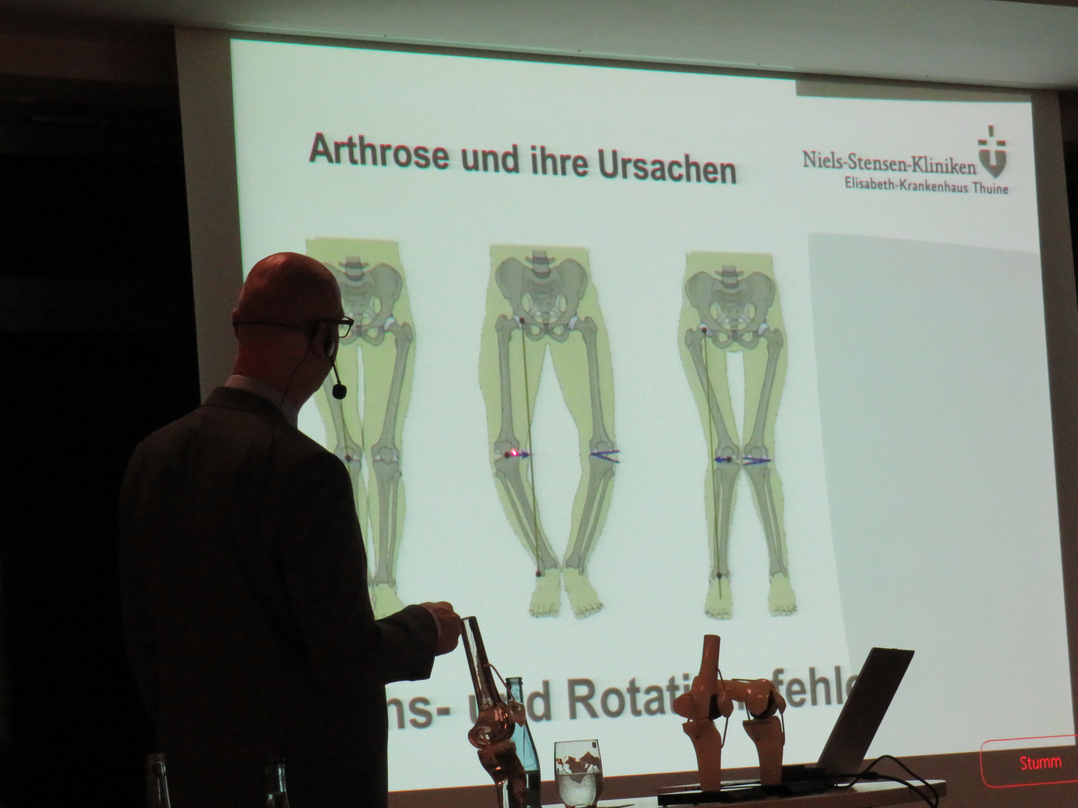 Schmitz ging bei dem Infoabend der Klinik für Orthopädie, Endoprothetik und Unfallchirurgie auf neueste Entwicklungen der Endoprothetik ein und zeigte mit seinen Kollegen in einer Live-OP am Kunstknochen, wie die Eingriffe vorgenommen werden.