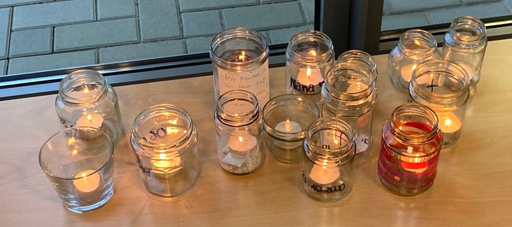 Die Schülerinnen und Schüler hatten dazu im Vorfeld jeweils ein Teelicht-Glas mit den Namen derer beschriftet, an die sie am Allerseelen-Tag besonders denken wollten: Neben den Namen vieler lieber Menschen waren aber auch Aufschriften wie: „Für Opa!“ - oder: „Für die Opfer von Terror und Gewalt“ zu lesen.