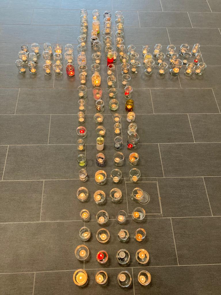 In Form eines großen Kreuzes standen sie den Vormittag hindurch für alle sichtbar in der Pausenhalle – ein starkes Zeichen des Trostes und des Lichtes, in das auch die um 11.15 Uhr europaweit stattfindende Gedenkminute einfließen konnte. Diese stand in der Schulgemeinschaft unter dem Motto „Toleranz und Achtsamkeit in der Begegnung miteinander“.