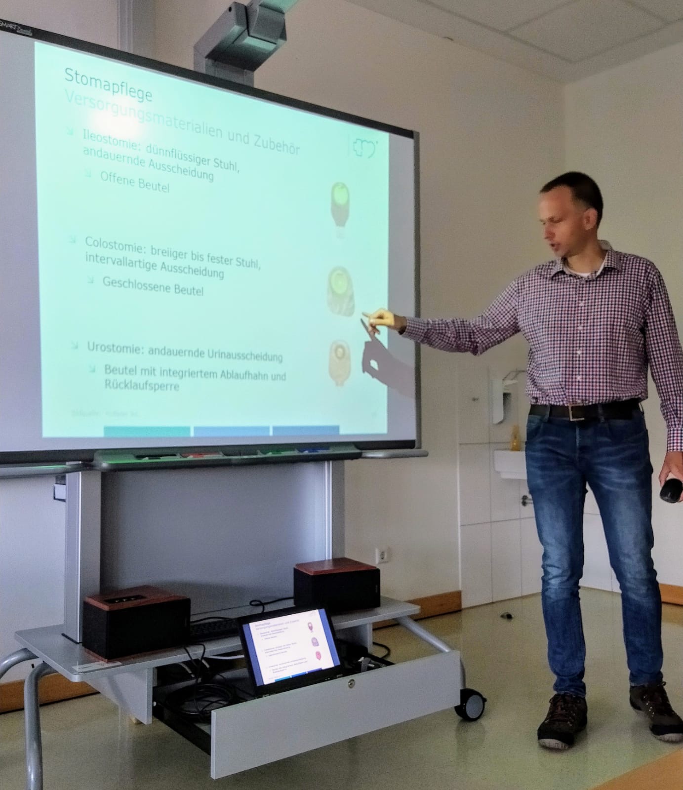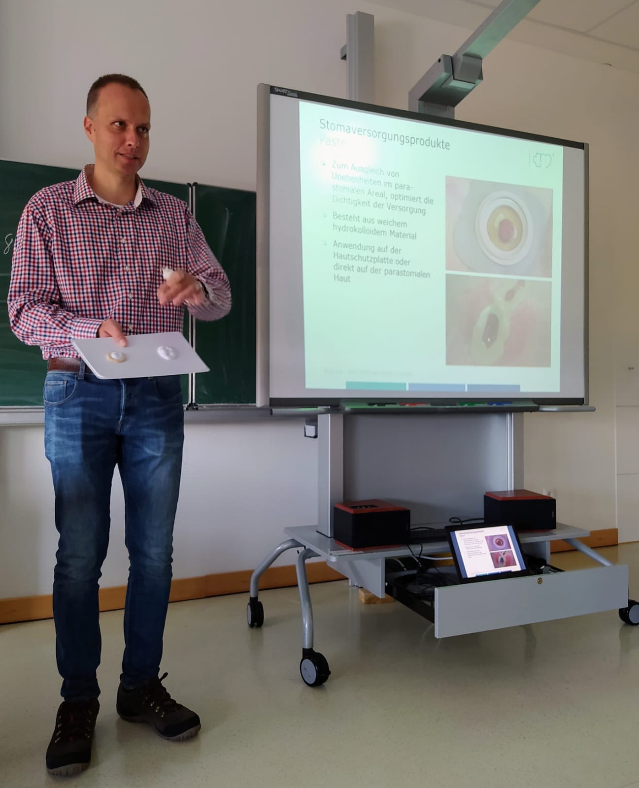 Im Rahmen ihres Unterrichtes zum Thema Leben mit einem künstlichen Darmausgang (Stoma) nahmen die Auszubildenden der dreijährigen Fachschule Heilerziehungspflege Klasse III an einem Vortrag von Pflegeexperte für Stoma Christian Ostholthoff teil.