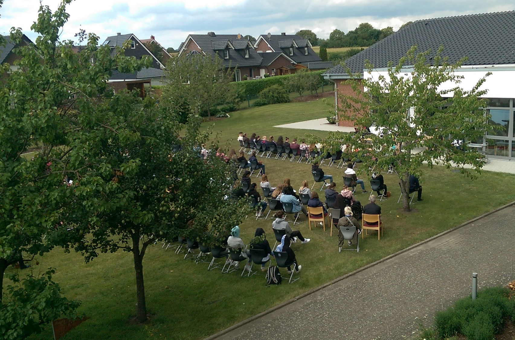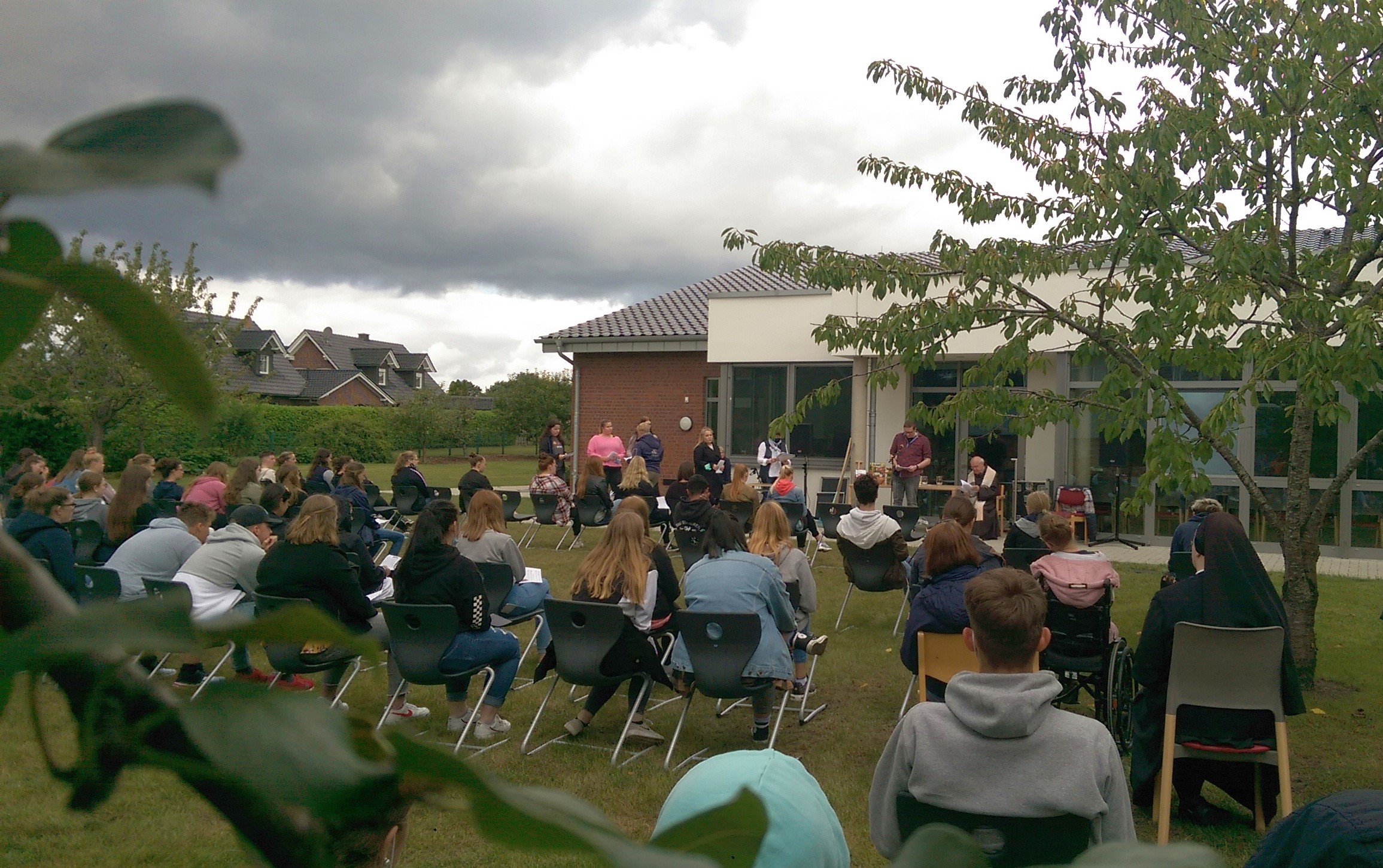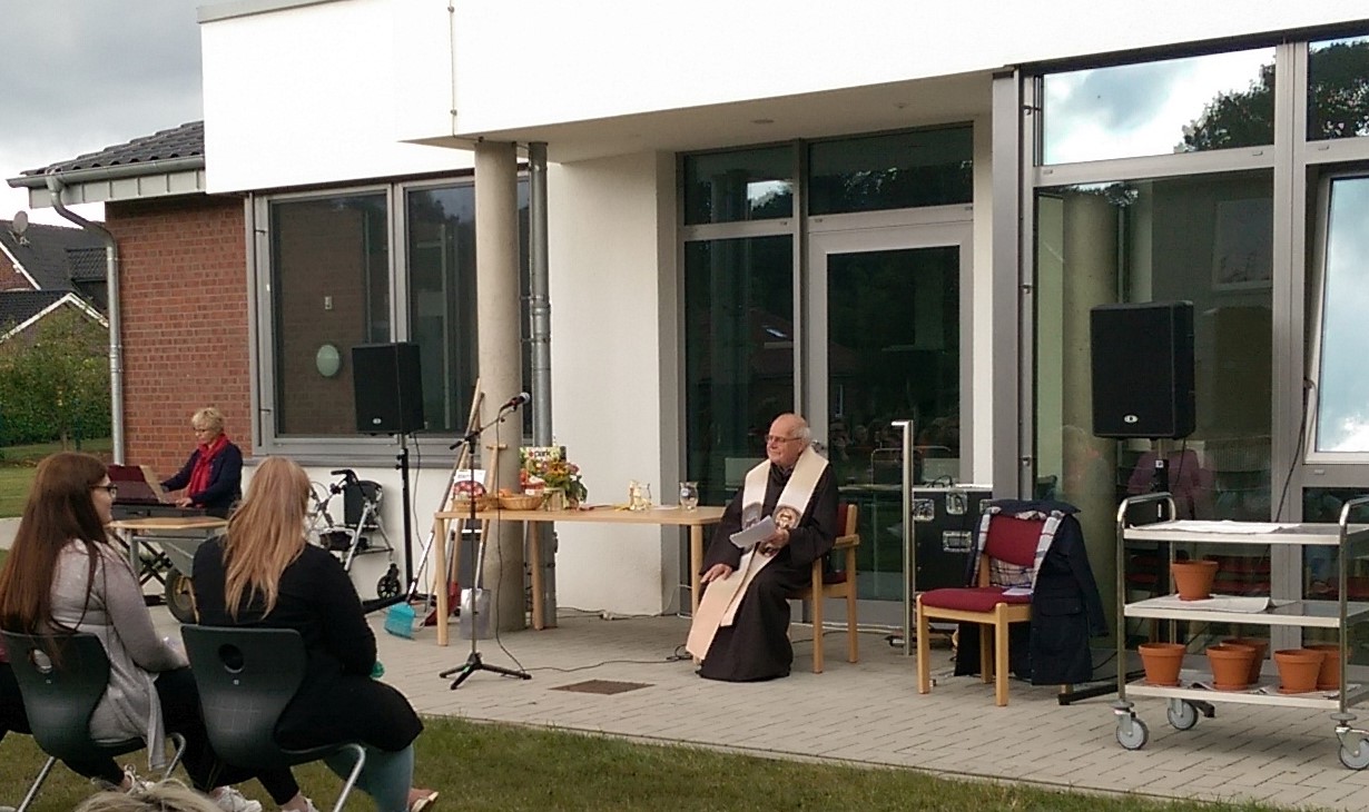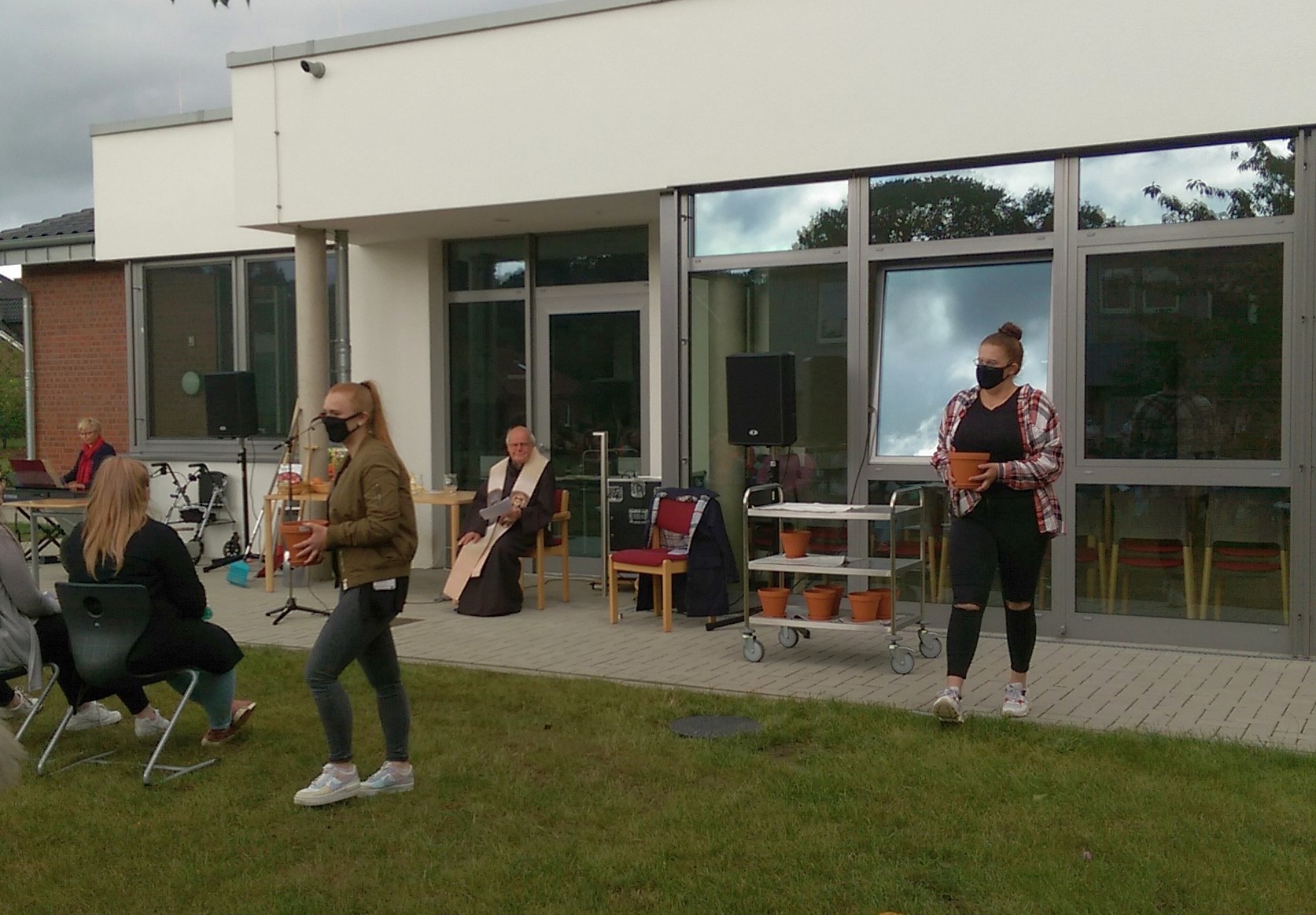 Unter dem Motto „Unser Garten soll erblühen!“ feierte die Schulgemeinschaft der BBS Thuine mit Pater Heinz-Günter Hilgefort den traditionellen Schuljahresanfangsgottesdienst, erstmalig im Garten der Schule.