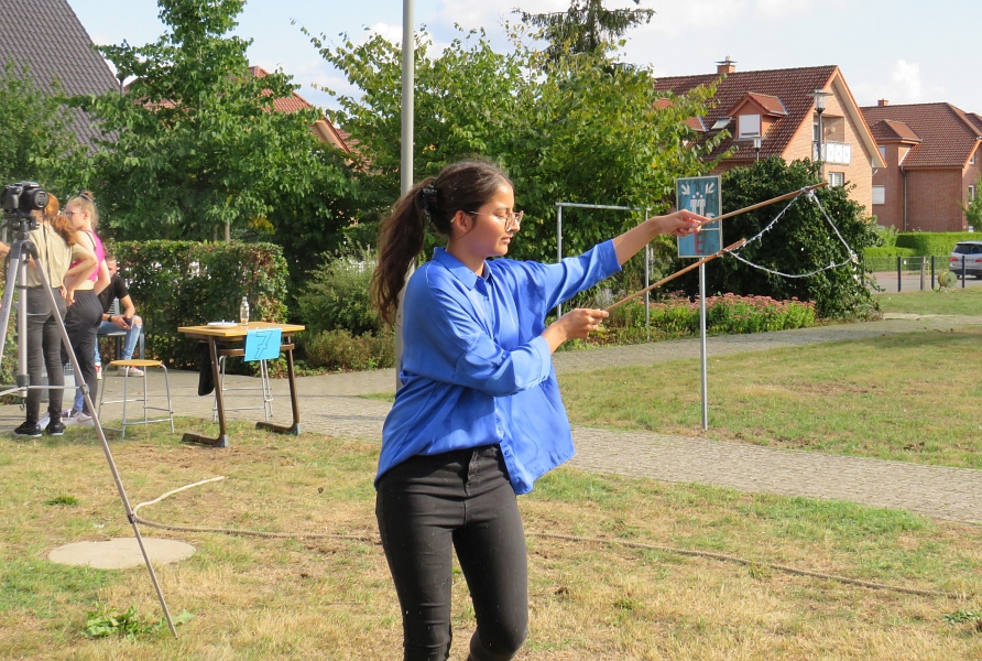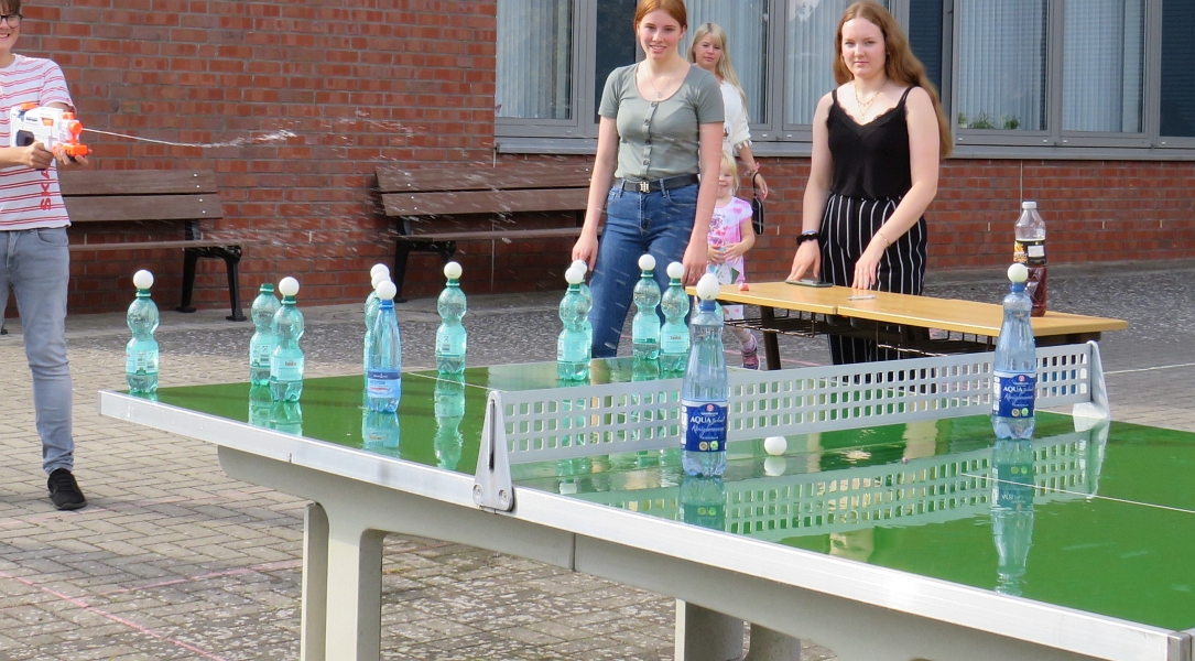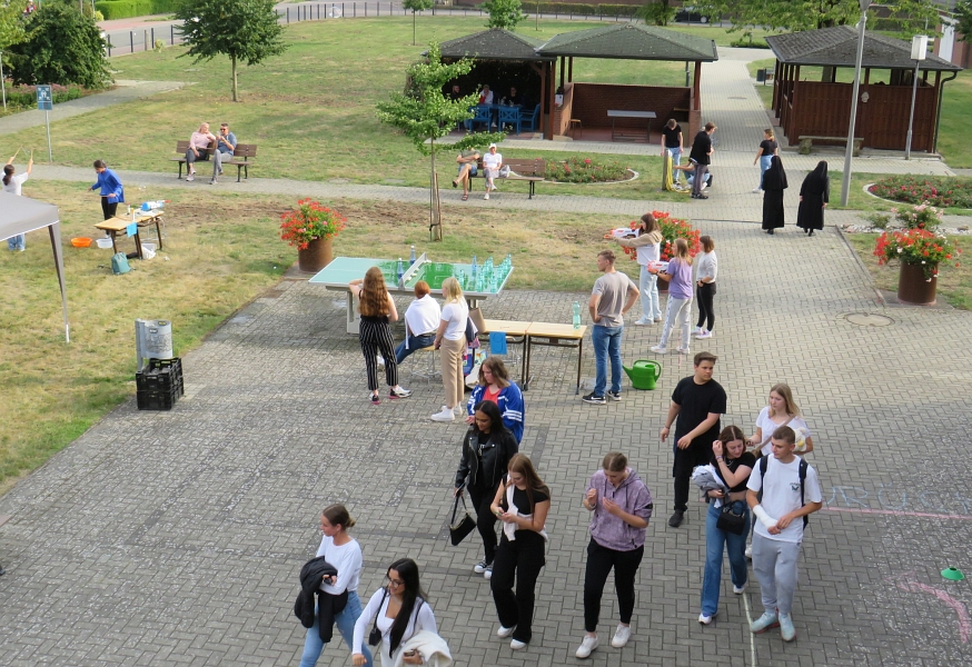 Zum 160-jährigen Schuljubiläum sollten nach einer viel zu langen Coronapause endlich wieder die Türen offen stehen für Gäste an der BBS Thuine und die folgten der Einladung und kamen in Scharen. Bei strahlendem Sonnenschein konnten Lehrer- und Schülerschaft gleich am Eingang des Schulgeländes zahlreiche kleine Gäste begrüßen, die begeistert einen Spieleparcours absolvierten: Bobbycarrennen, Sackhüpfen, Tauziehen, Wasserbomben fischen oder Riesenseifenblasen machen: Die insgesamt neun Stationen kamen so gut an bei den kleinen Gästen, dass viele gar nicht genug bekommen konnten und sich immer wieder bei den Spieleklassikern anstellten.
