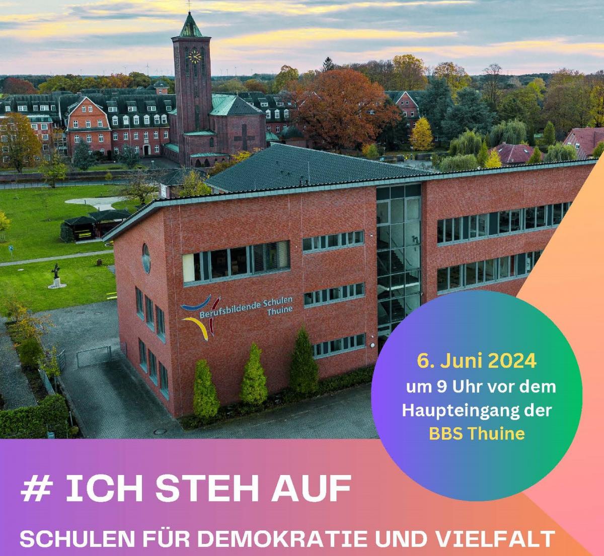 Unter dem Motto „# IchStehAuf“ wurden am vergangenen Donnerstag bundesweit Schulen aufgerufen, ein Zeichen für die Demokratie zu setzen. Die Schülerinnen und Schüler der BBS Thuine nahmen dies zum Anlass, zahlreiche Gäste zu einer beeindruckenden Kundgebung einzuladen.