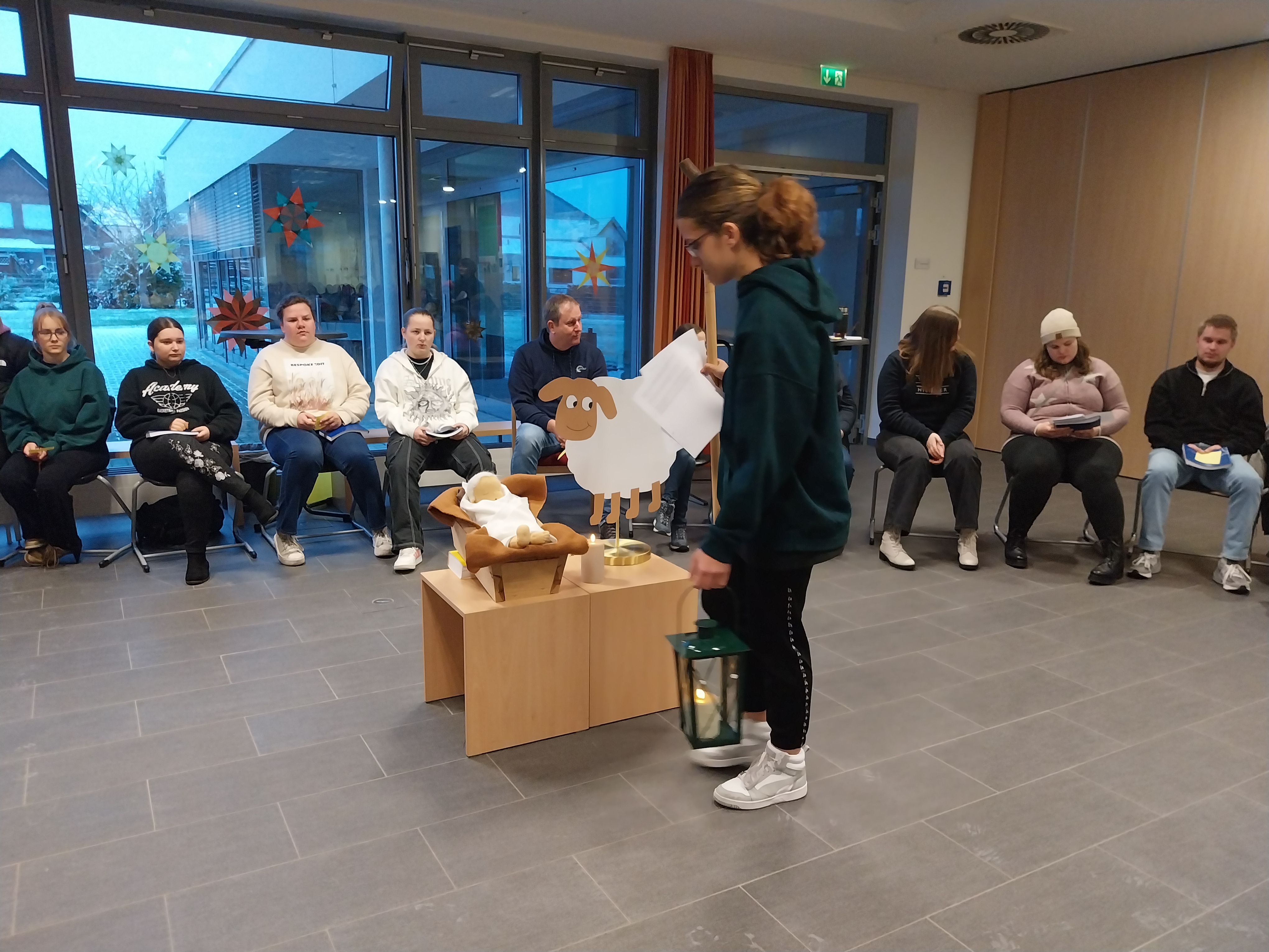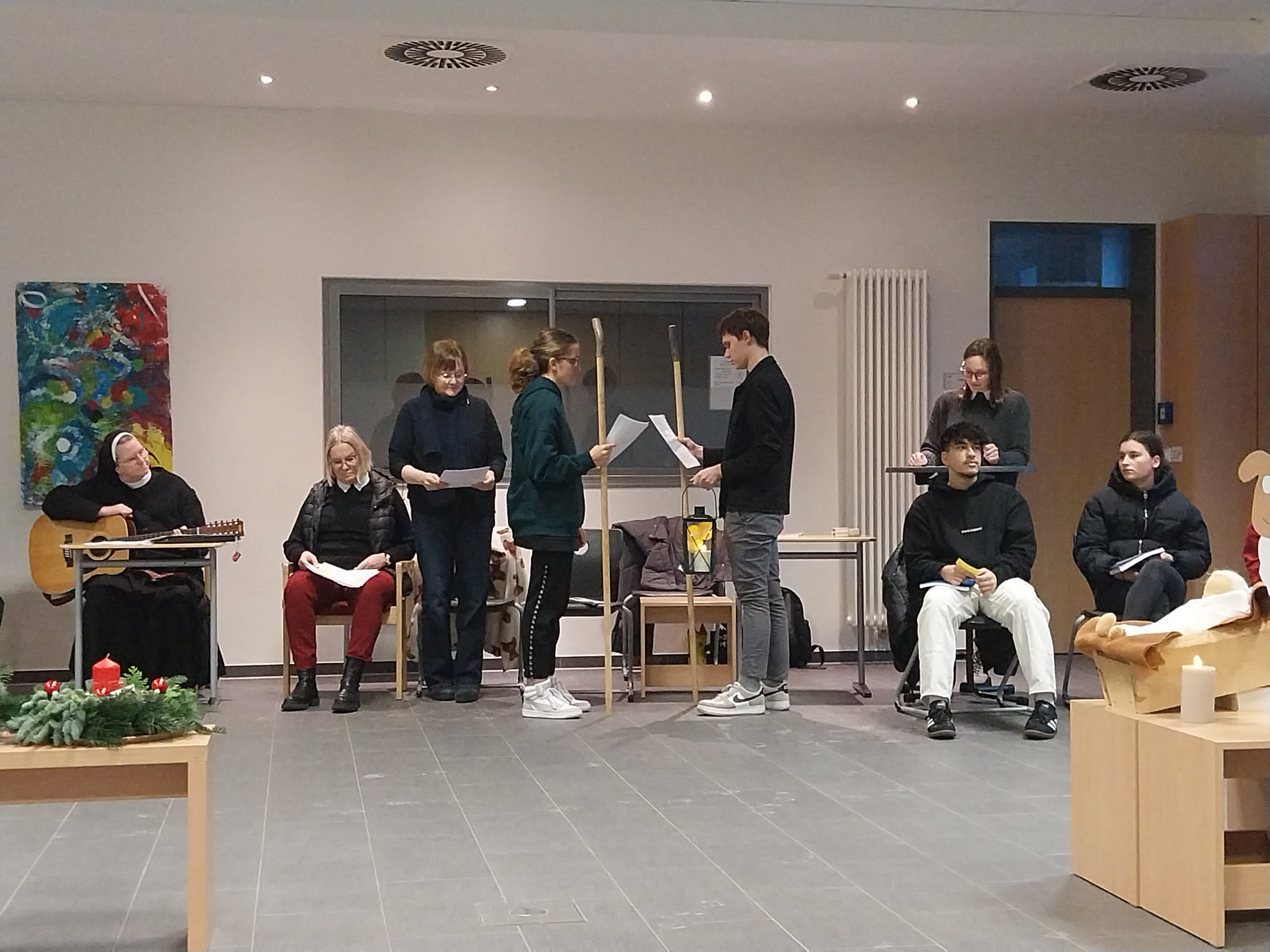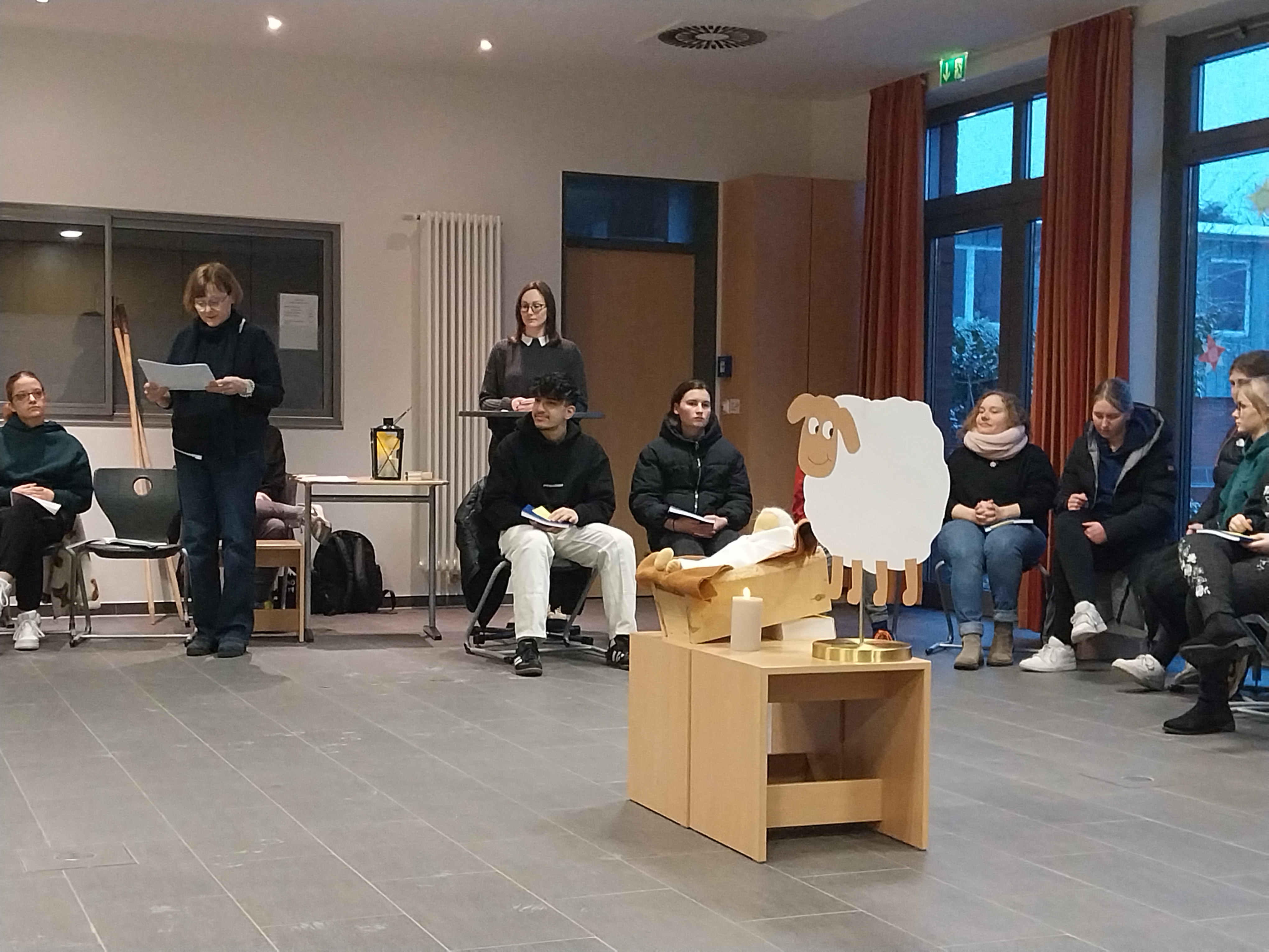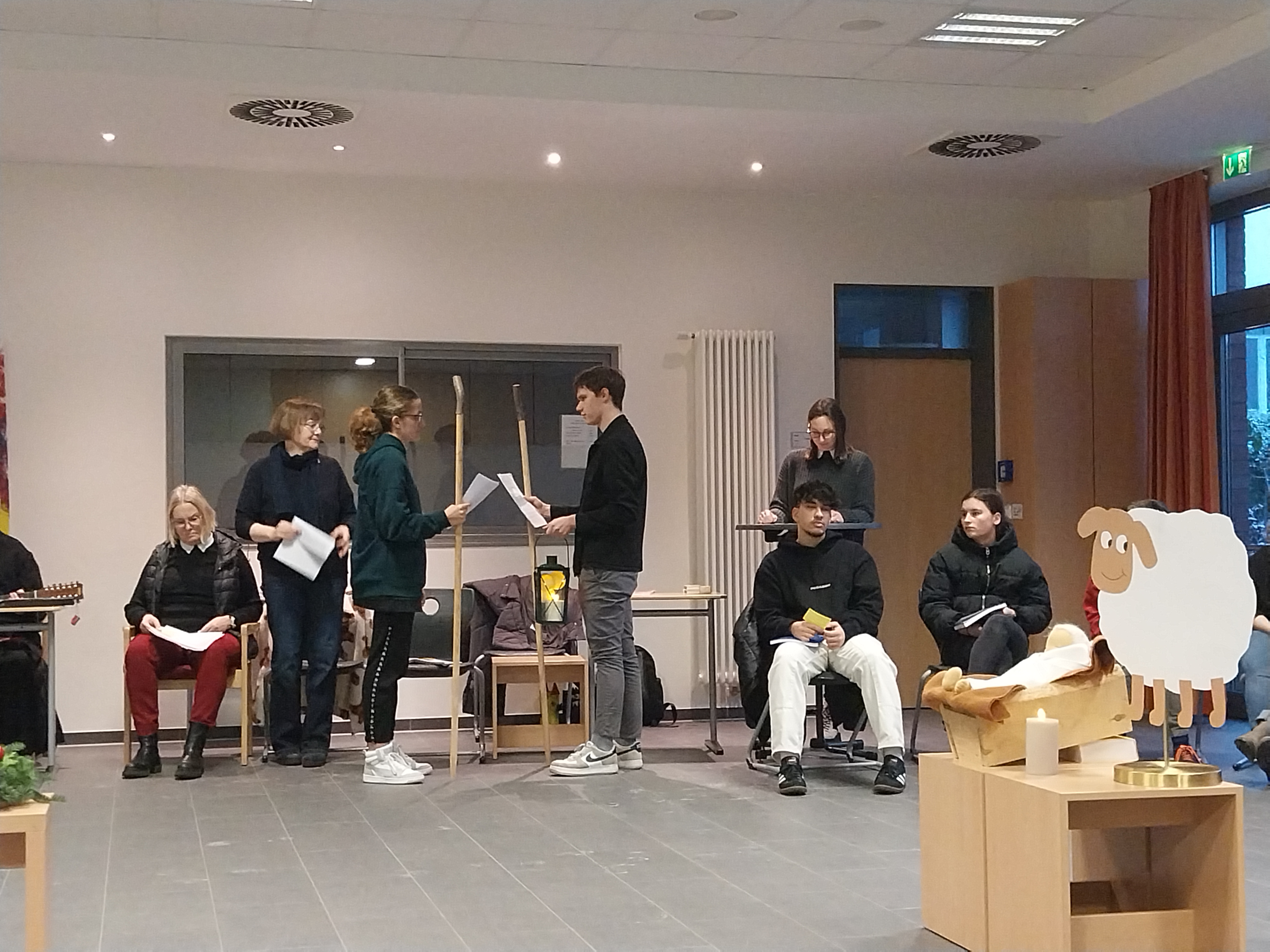 Was es mit dem Licht und vor allem dem Teilen des Lichtes in einer von Dunkelheit geprägten Welt auf sich hat, veranschaulichten Schüler*innen der EH2, SP2 und PA 2 in einem kleinen Hirtenspiel. Einleitend hieß es: „Keine Zeit ist so dunkel wie der Advent. Es ist die Zeit der längsten Nächte und der kürzesten Tage. Wir erleben diese Adventszeit in einer besonderen Krisenzeit. Hohe Preise, Zukunftsängste und der Krieg in der Ukraine und Israel bereiten uns große Sorgen. Viele Klassenarbeiten und persönliche Herausforderungen kosten Kraft, Mut und Anstrengungen. So wird besonders dieser Advent eine Zeit der Hoffnung und der Sehnsucht nach Frieden, Freude, Glück und nach dem Licht: Das Licht, das mit der Ankunft des Herrn verbunden ist.“