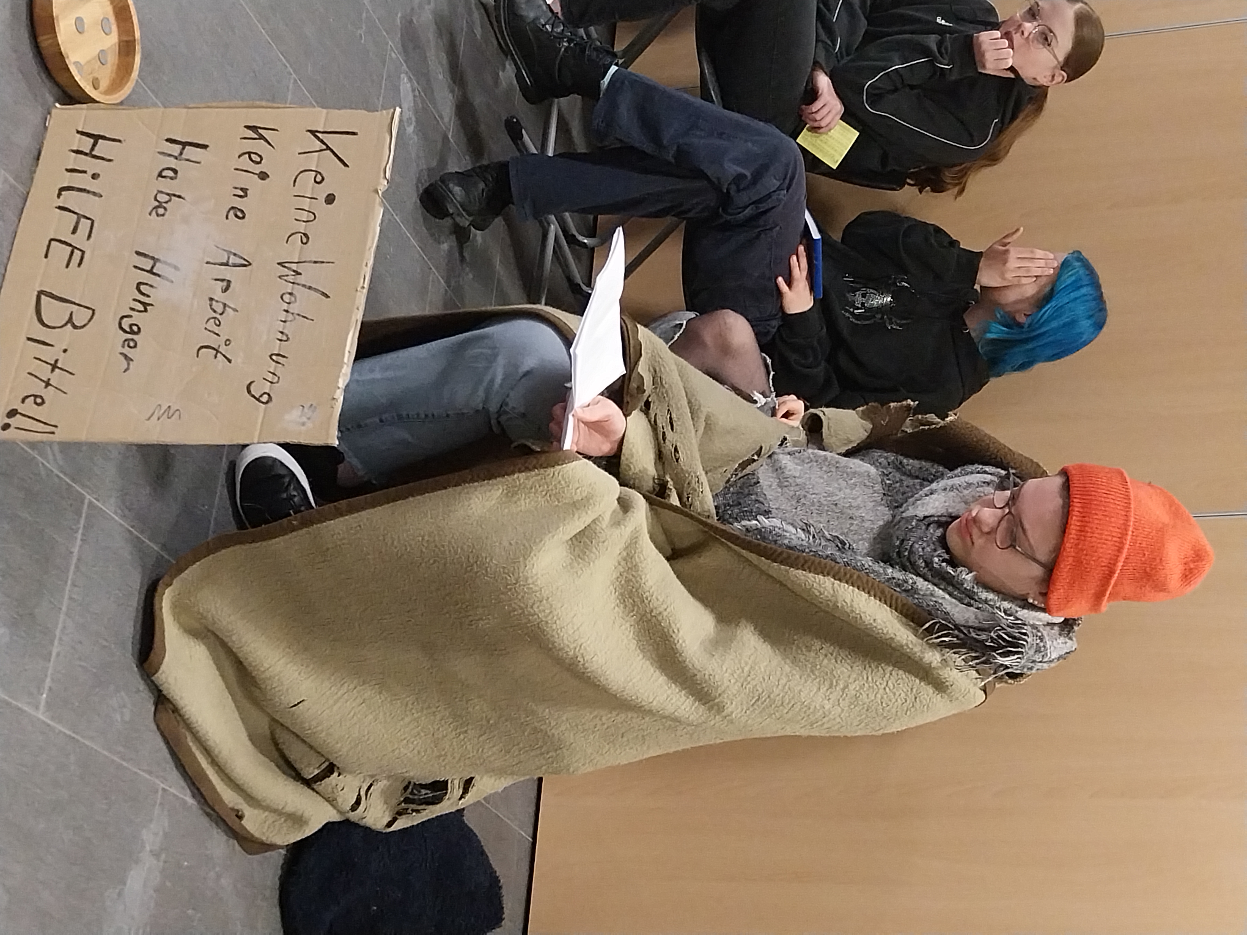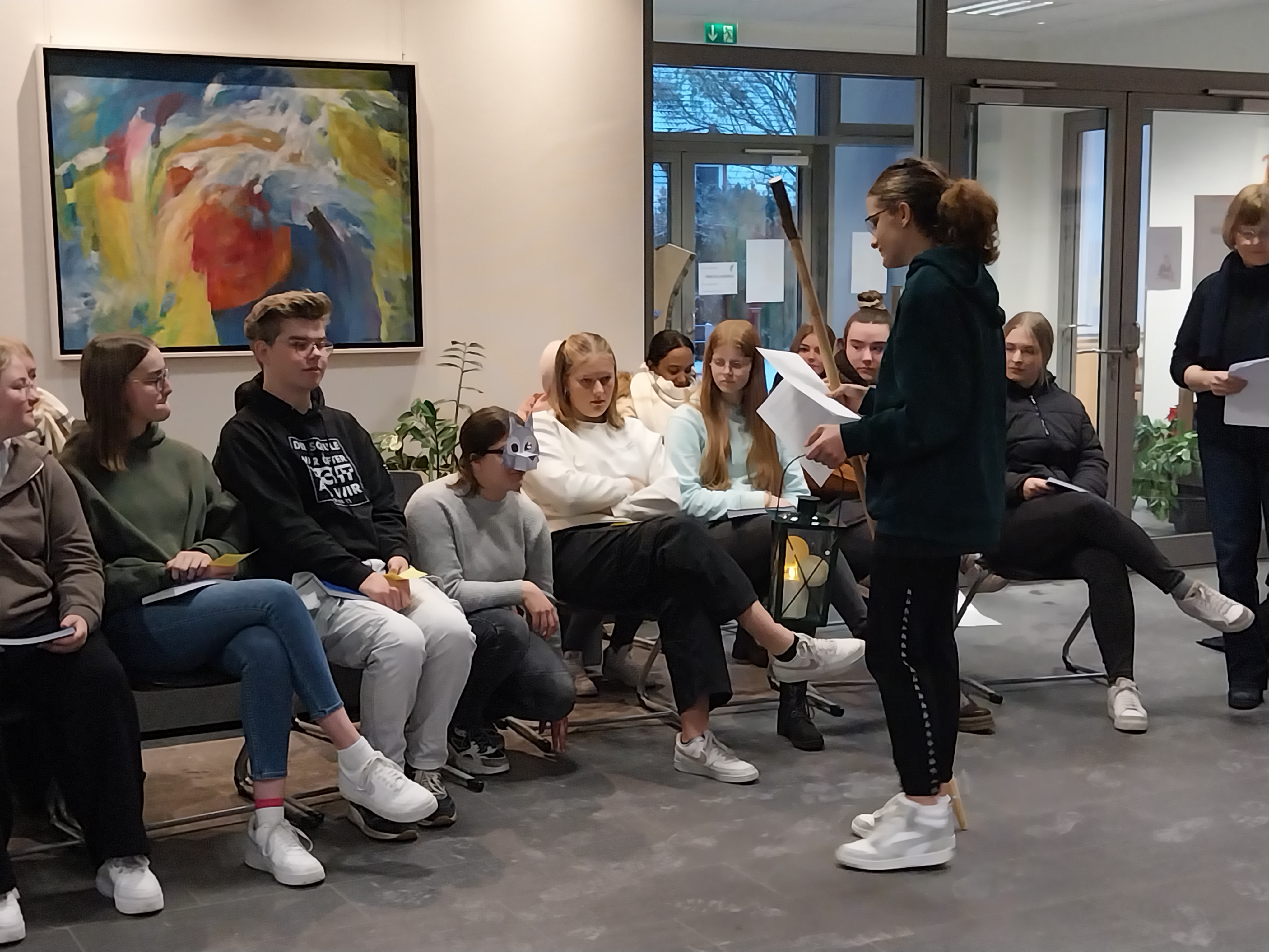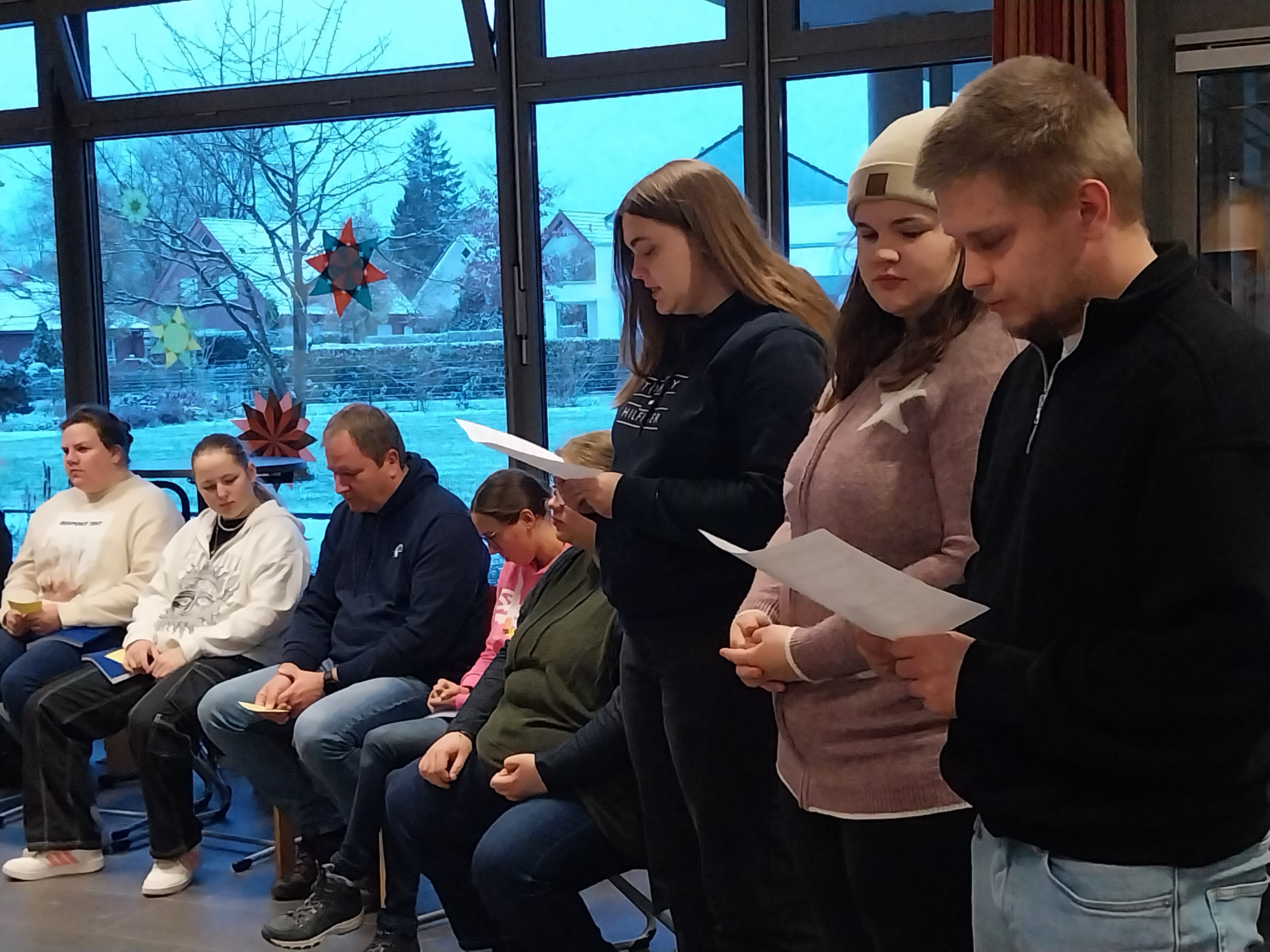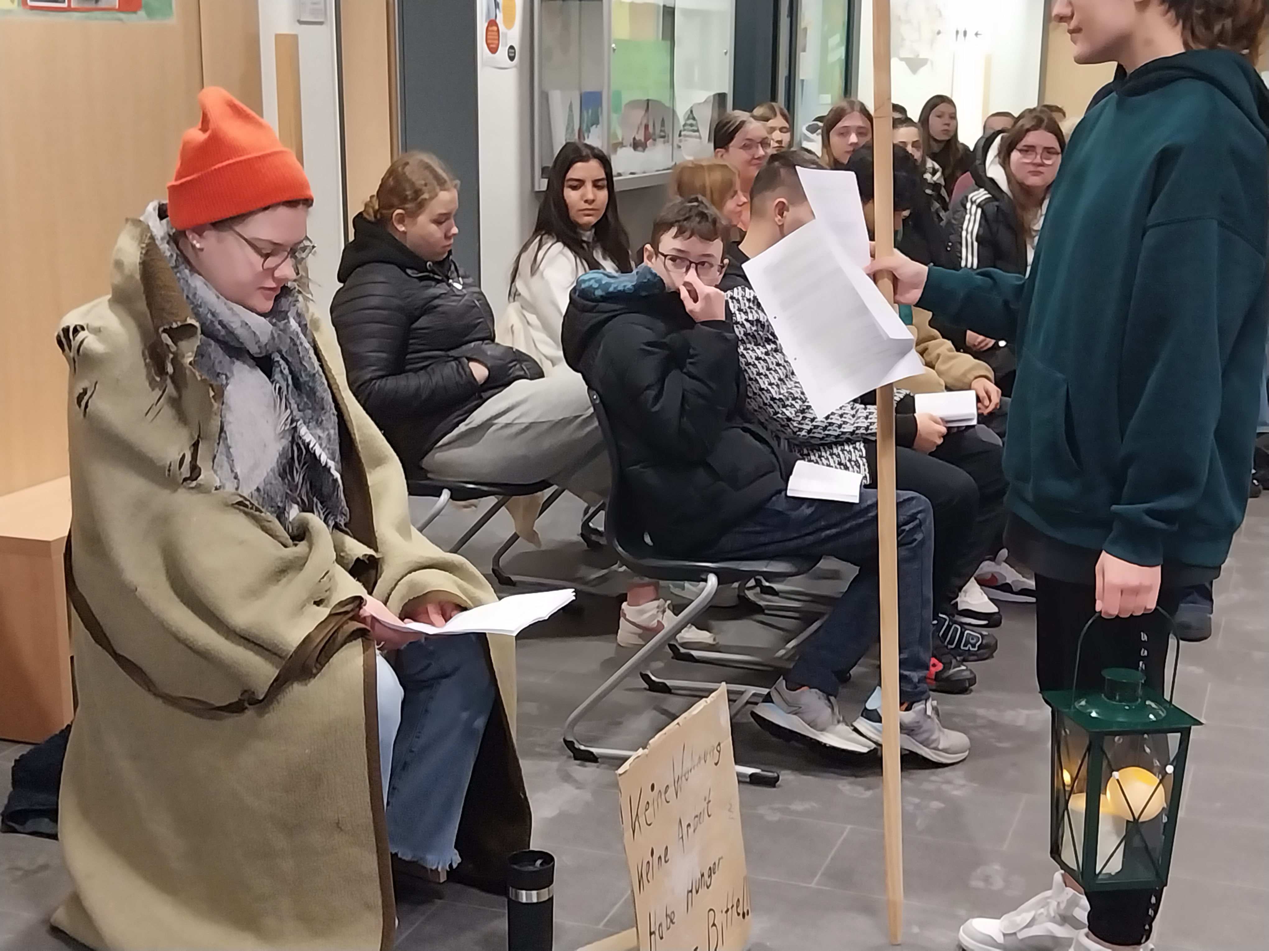Was es mit dem Licht und vor allem dem Teilen des Lichtes in einer von Dunkelheit geprägten Welt auf sich hat, veranschaulichten Schüler*innen der EH2, SP2 und PA 2 in einem kleinen Hirtenspiel. Einleitend hieß es: „Keine Zeit ist so dunkel wie der Advent. Es ist die Zeit der längsten Nächte und der kürzesten Tage. Wir erleben diese Adventszeit in einer besonderen Krisenzeit. Hohe Preise, Zukunftsängste und der Krieg in der Ukraine und Israel bereiten uns große Sorgen. Viele Klassenarbeiten und persönliche Herausforderungen kosten Kraft, Mut und Anstrengungen. So wird besonders dieser Advent eine Zeit der Hoffnung und der Sehnsucht nach Frieden, Freude, Glück und nach dem Licht: Das Licht, das mit der Ankunft des Herrn verbunden ist.“