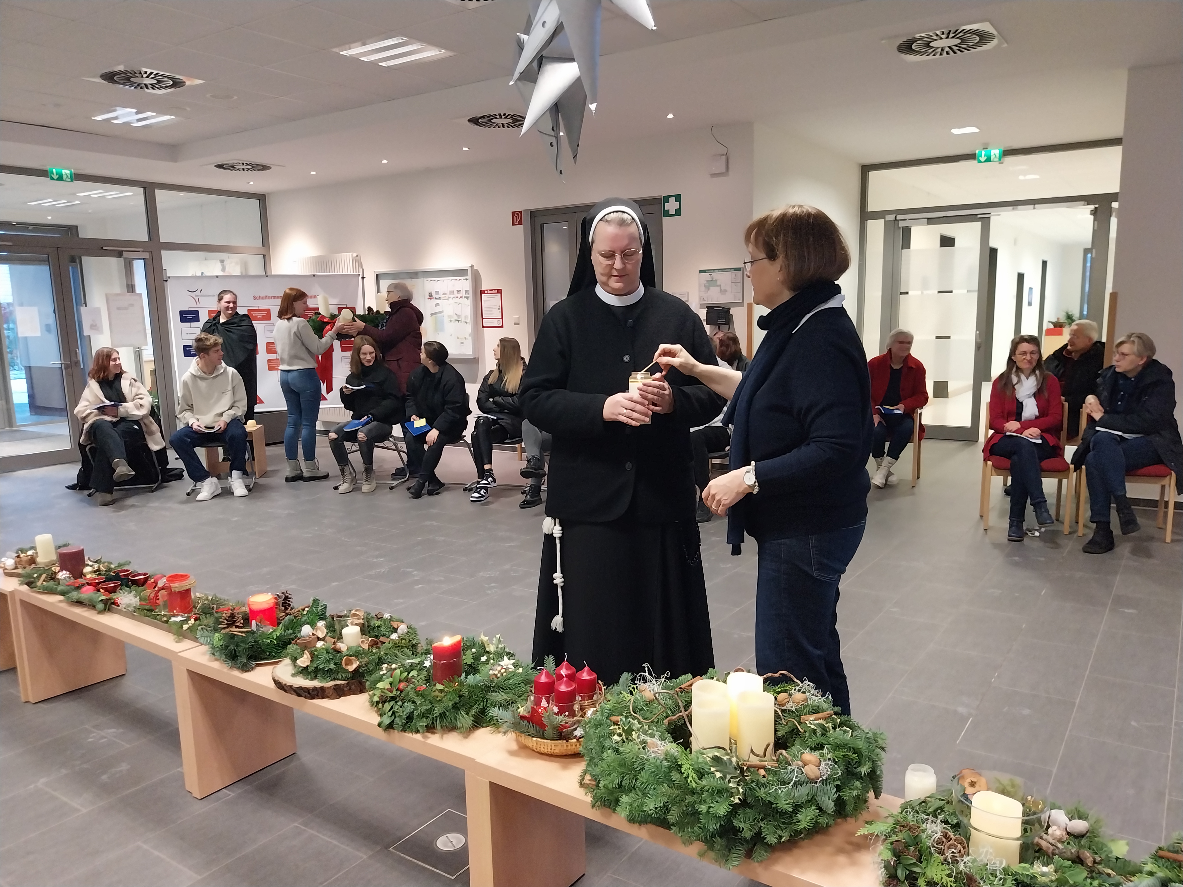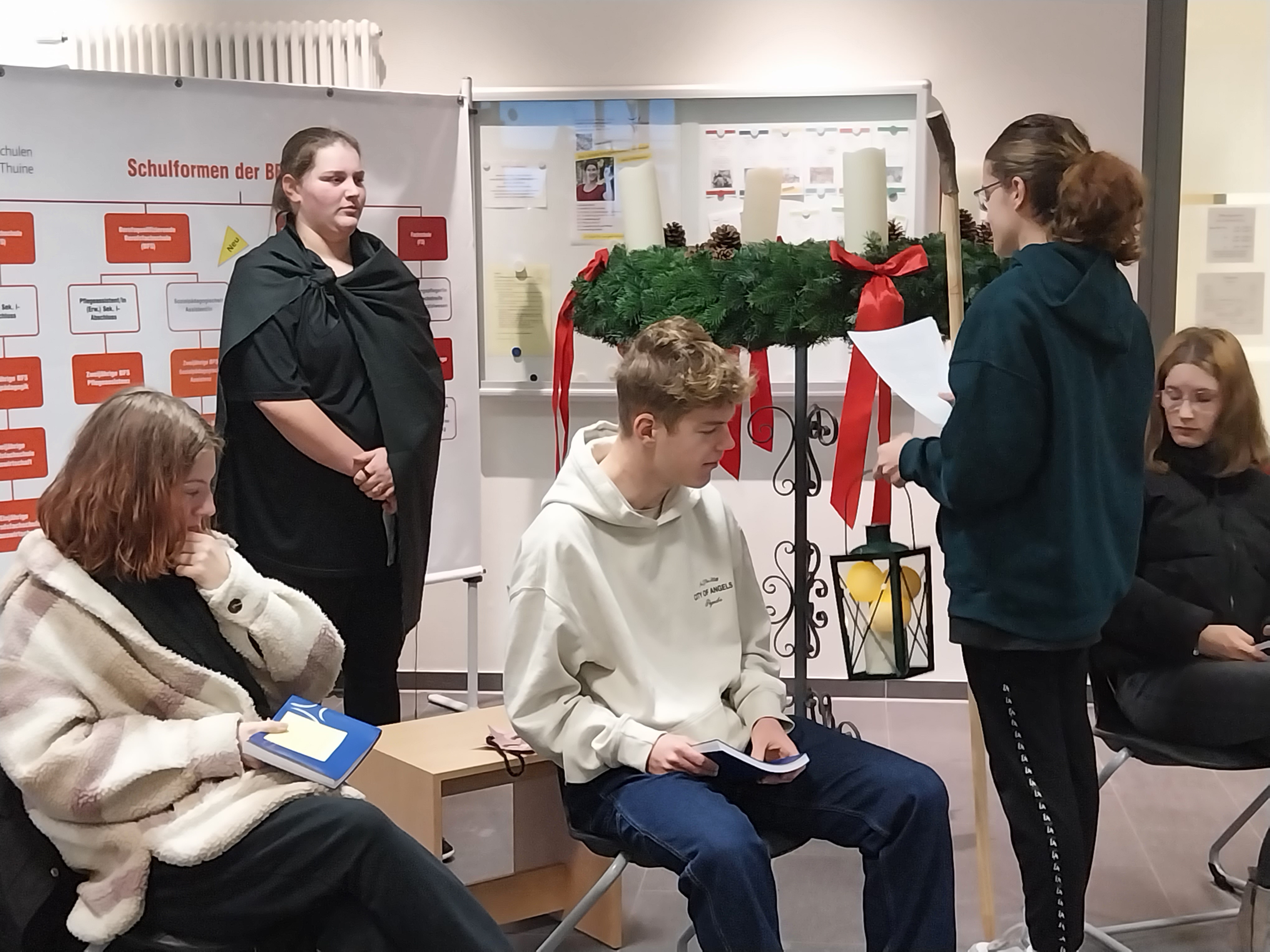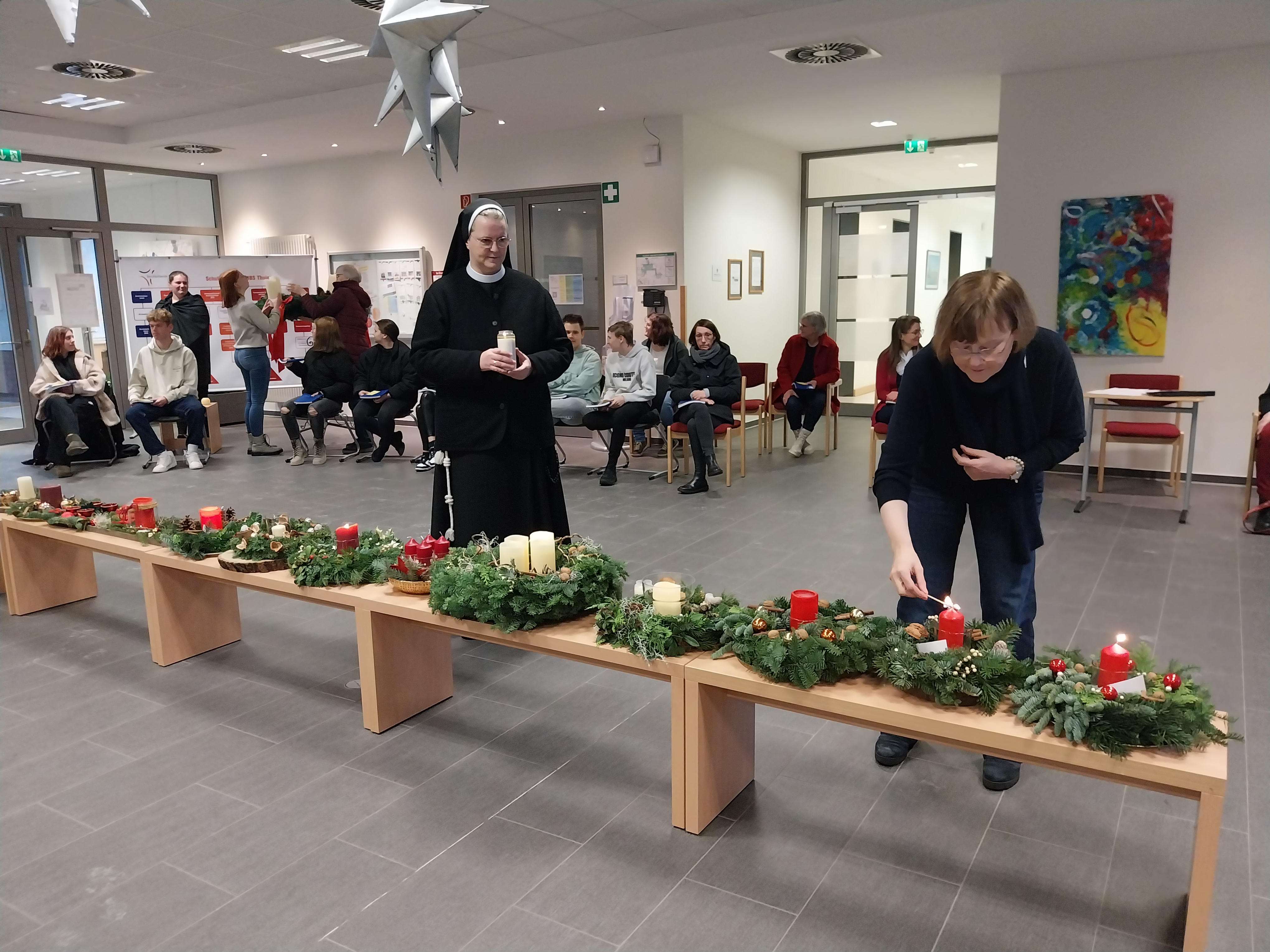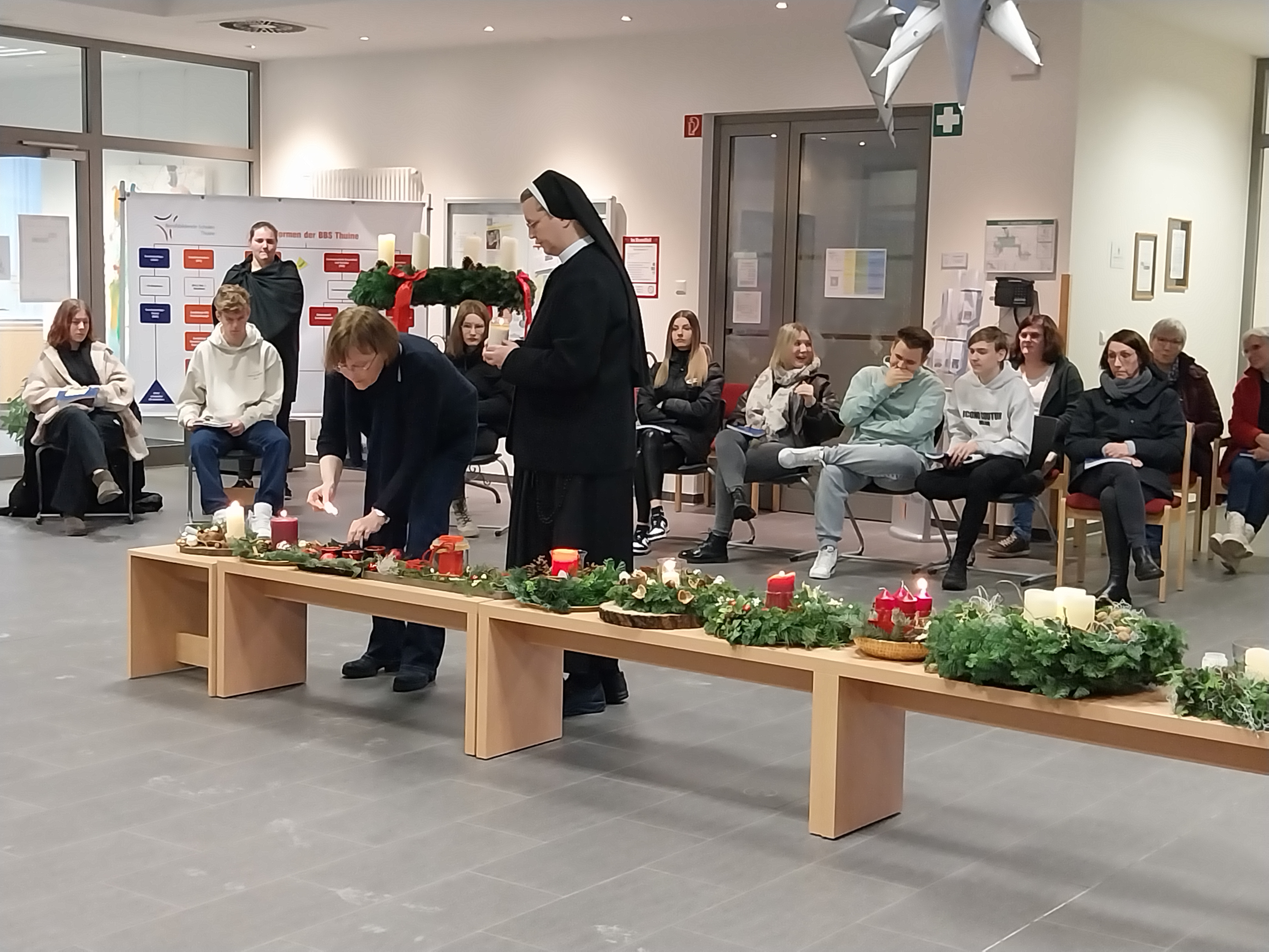 Im Rahmen einer Lichtfeier der gesamten Schulgemeinschaft haben wir nun, am heutigen Montag, die erste Kerze der Adventskränze entzündet. Dazu war in den frühen Morgenstunden bereits eine Kerze mit dem Licht aus der Anbetungskapelle aus dem Kloster nebenan in die Schule getragen worden. Dort beten die Ordensschwestern Tag und Nacht in den vielen Anliegen der Welt und natürlich auch in denen der BBS Thuine. Bethlehem heißt „Haus des Brotes“ und so, wie die Hirten vor dem Kind in der Krippe niederknieten, tun es die Schwestern in der Anbetungskapelle.