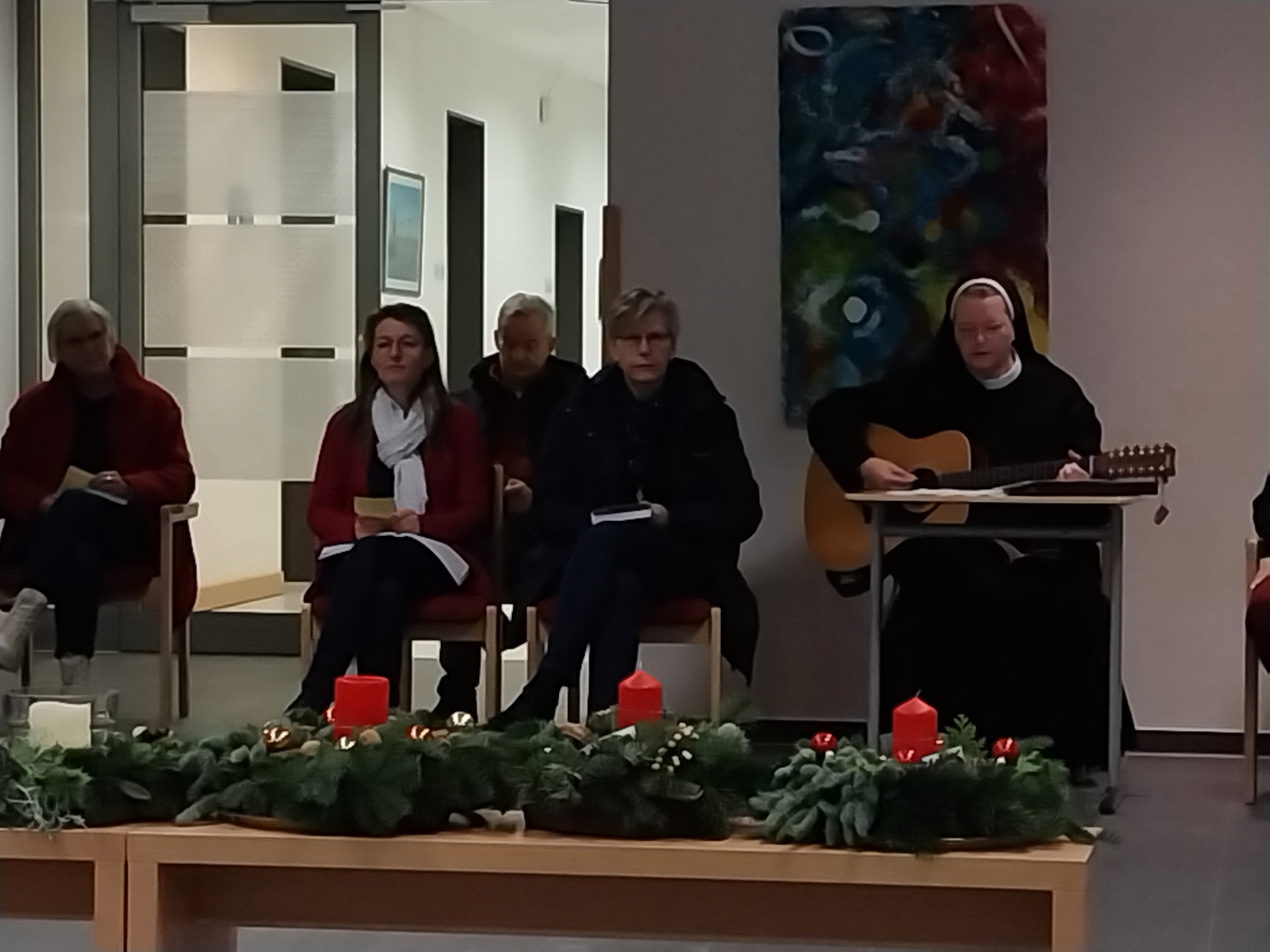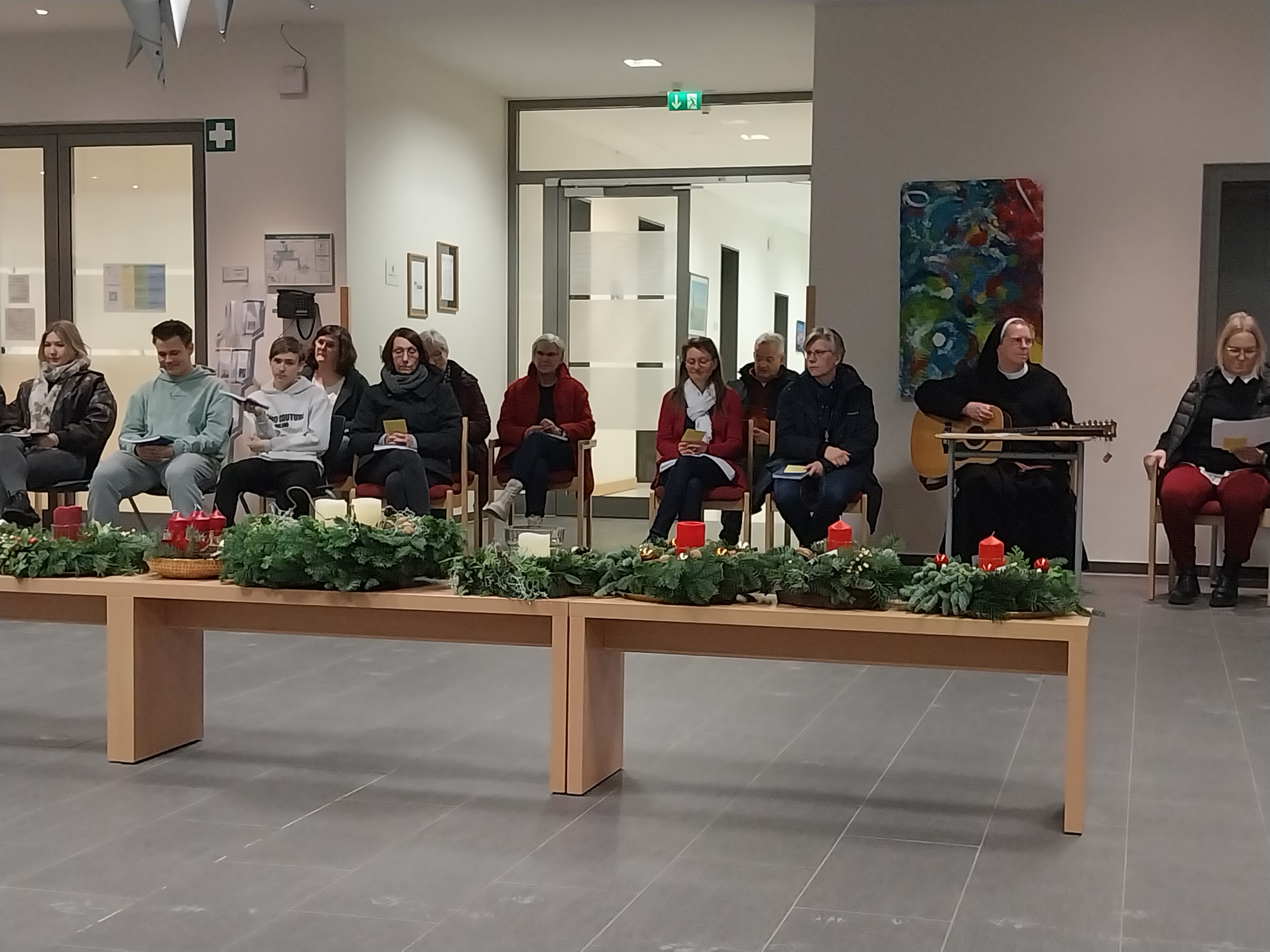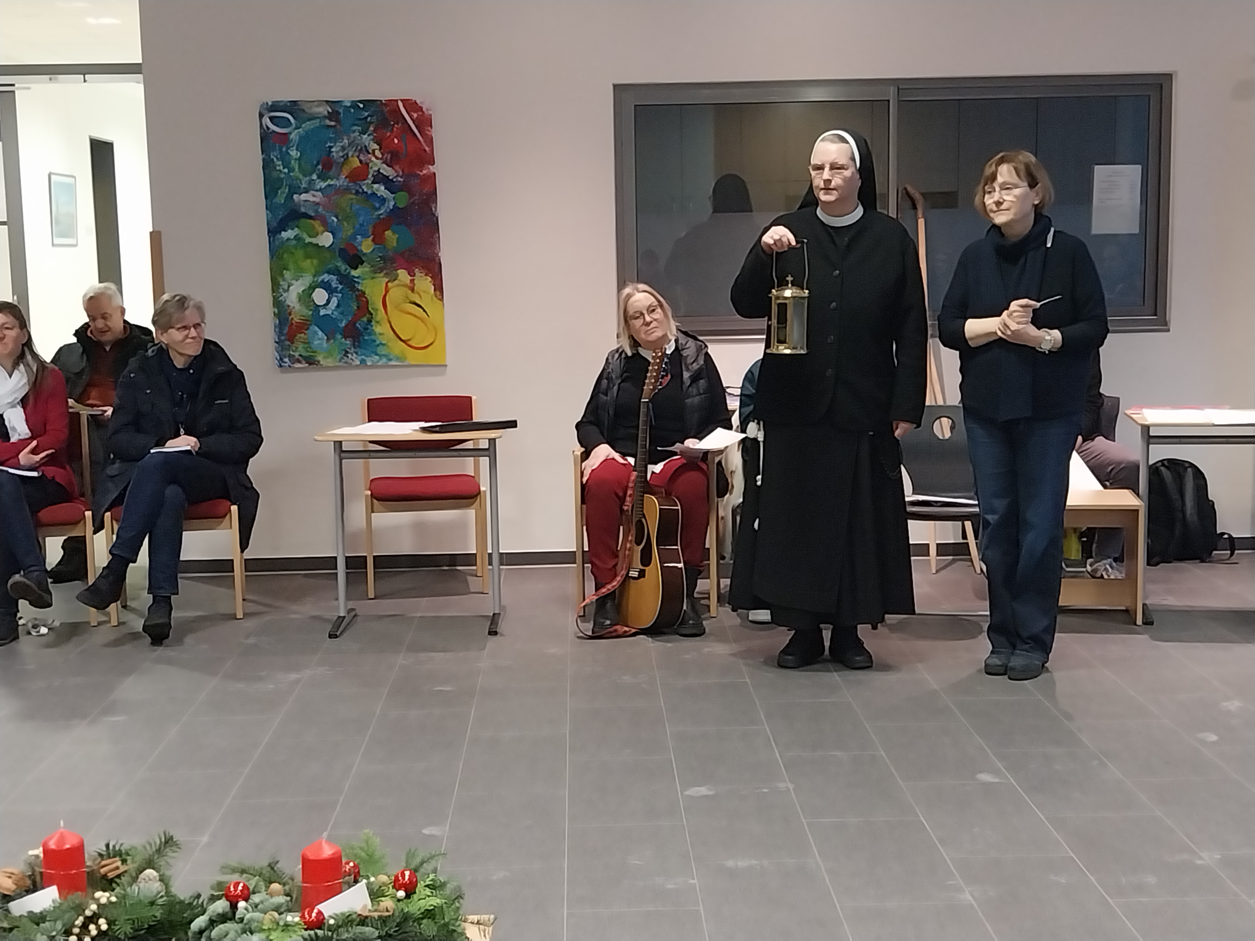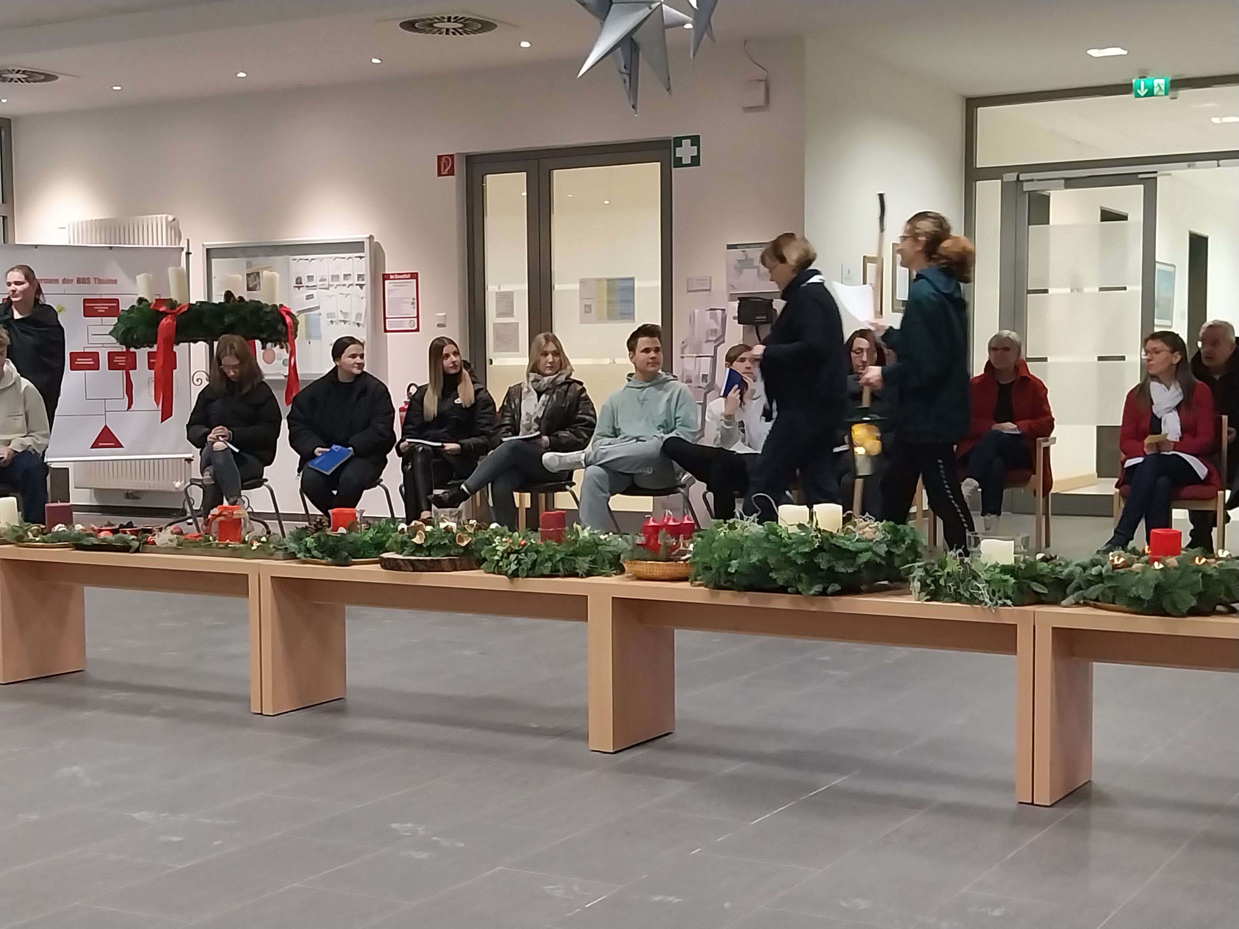 Im Rahmen einer Lichtfeier der gesamten Schulgemeinschaft haben wir nun, am heutigen Montag, die erste Kerze der Adventskränze entzündet. Dazu war in den frühen Morgenstunden bereits eine Kerze mit dem Licht aus der Anbetungskapelle aus dem Kloster nebenan in die Schule getragen worden. Dort beten die Ordensschwestern Tag und Nacht in den vielen Anliegen der Welt und natürlich auch in denen der BBS Thuine. Bethlehem heißt „Haus des Brotes“ und so, wie die Hirten vor dem Kind in der Krippe niederknieten, tun es die Schwestern in der Anbetungskapelle.