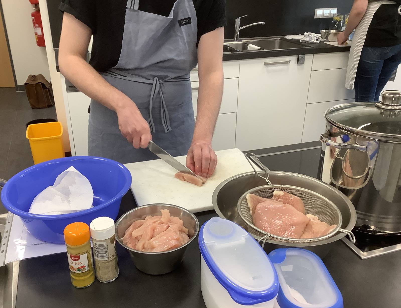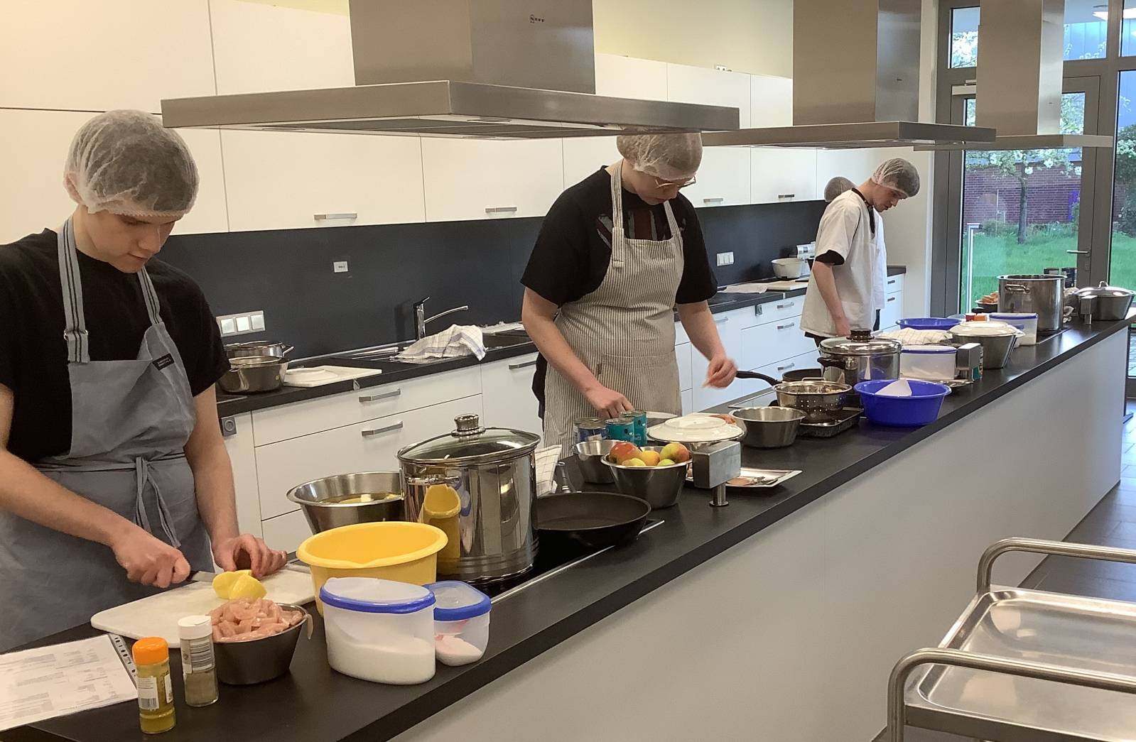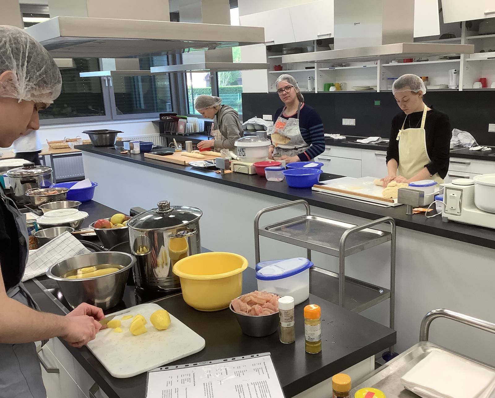 Die Auszubildenden im Bildungsgang Ernährung und Hauswirtschaft können ihre erworbenen Fähigkeiten heute praktisch anwenden. Natürlich wird auch im Schulalltag der Klasse sehr viel selber gekocht, aber viele wissen vielleicht aus ihrer heimischen Küche, dass Kochen für Besuch meistens deutlich herausfordernder ist.