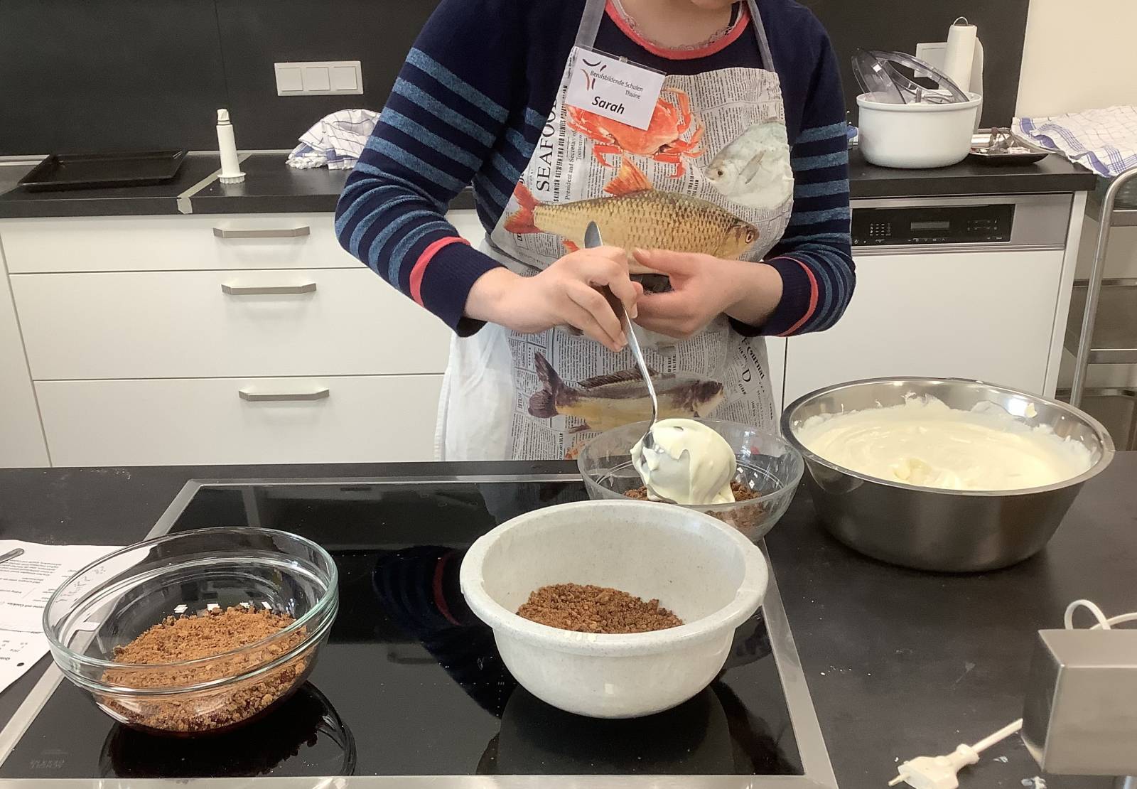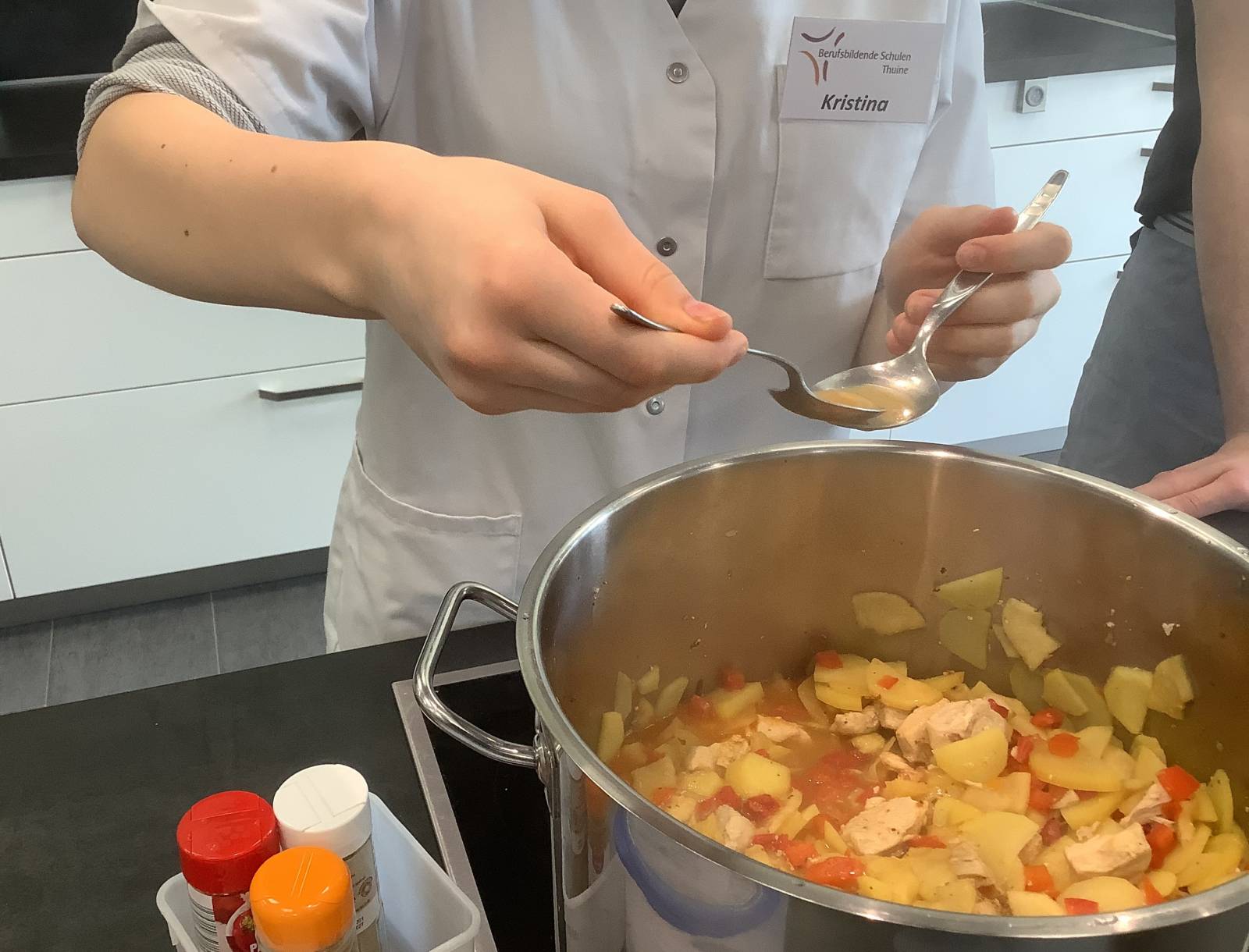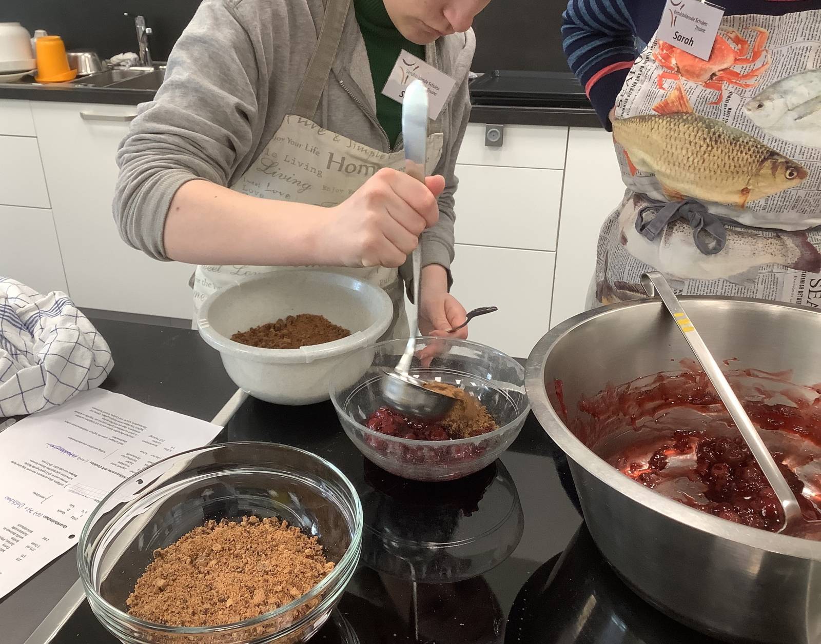Eine Besonderheit ist die Kooperation mit den Berufsbildenden Schulen Thuine und der Frerener Pfarreiengemeinschaft, die den Mittagstisch initiiert hat. Im Rahmen eines Projektes haben die Schüler:innen der Berufsfachschule Ernährung und Hauswirtschaft ein Menü entwickelt, Tischdeko hergestellt,Tische gedeckt und sich mit viel Engagement die Bewirtung unserer Gäste gekümmert. Auf dem Speiseplan stand "Pikanter Hähnchentopf mit Quarkbrötchen, als Nachtisch Frischkäse-Joghurt-Creme mit Kirschen und Cookies".