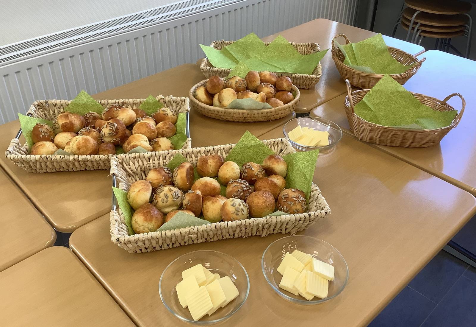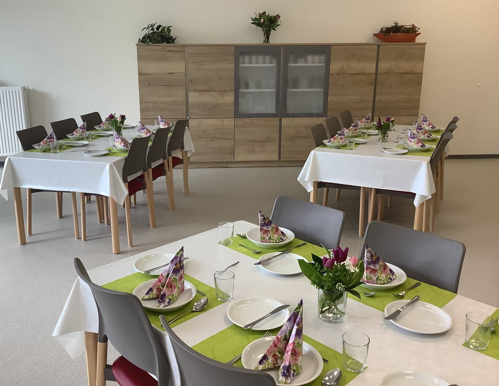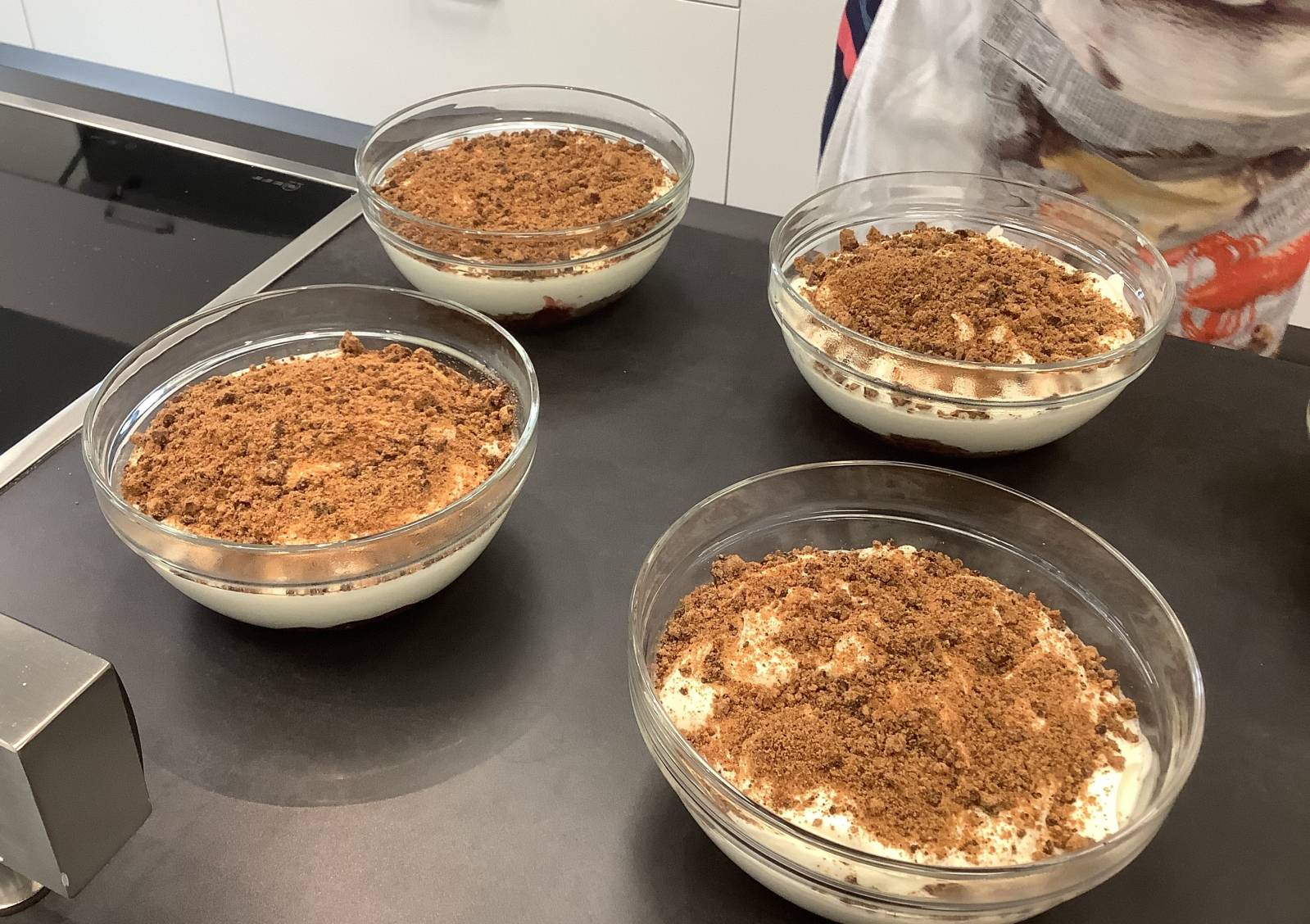 Eine Besonderheit ist die Kooperation mit den Berufsbildenden Schulen Thuine und der Frerener Pfarreiengemeinschaft, die den Mittagstisch initiiert hat. Im Rahmen eines Projektes haben die Schüler:innen der Berufsfachschule Ernährung und Hauswirtschaft ein Menü entwickelt, Tischdeko hergestellt,Tische gedeckt und sich mit viel Engagement die Bewirtung unserer Gäste gekümmert. Auf dem Speiseplan stand "Pikanter Hähnchentopf mit Quarkbrötchen, als Nachtisch Frischkäse-Joghurt-Creme mit Kirschen und Cookies".